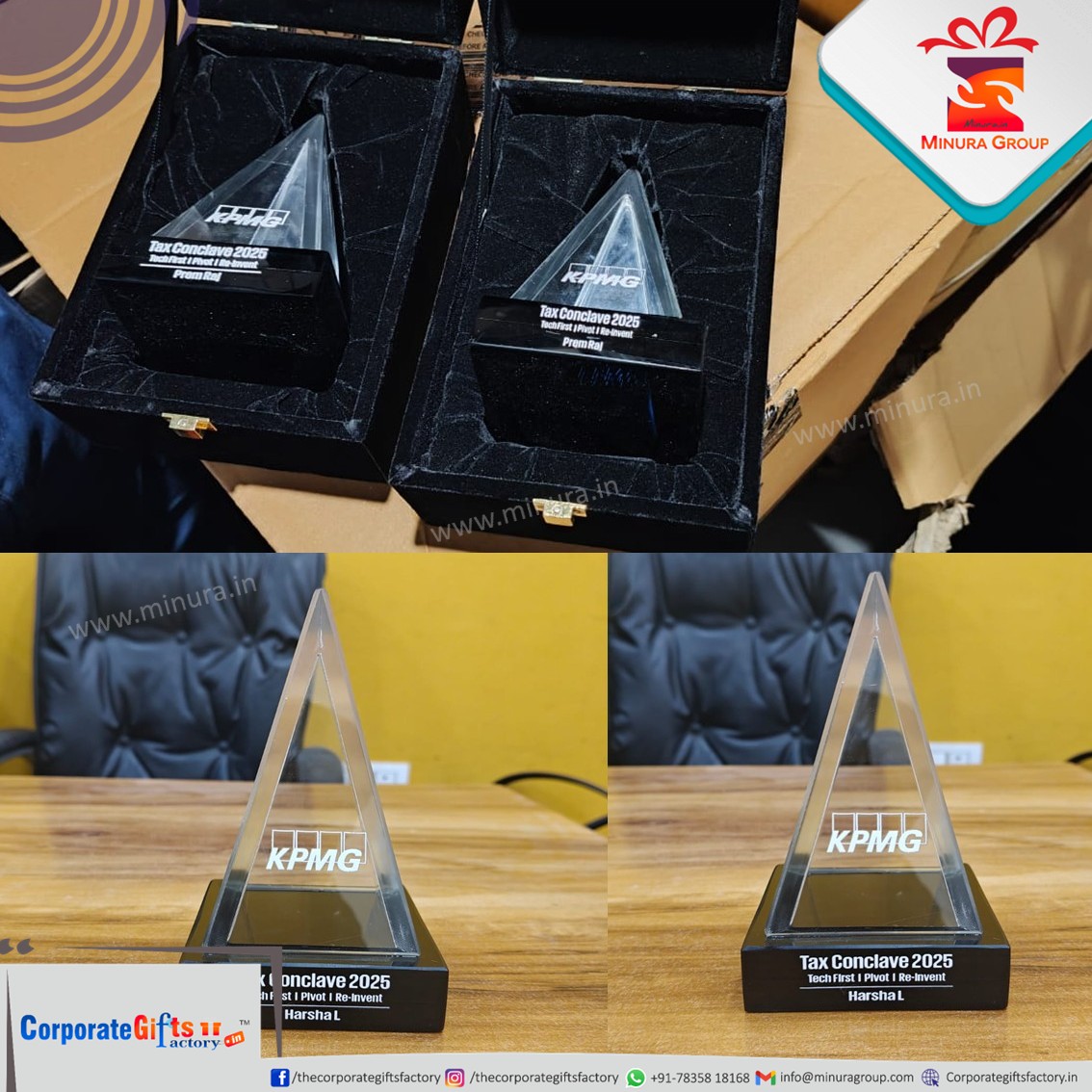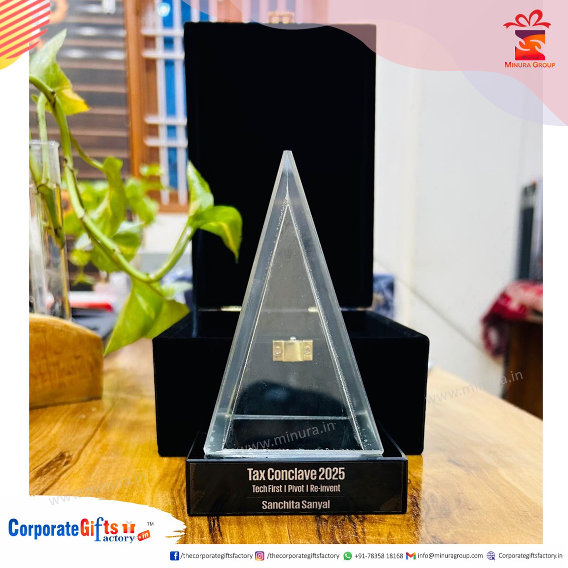 We manufactured a custom pyramid-shaped clear acrylic memento for Tax Conclave 2025, featuring logo etching, event branding, and name personalisation.