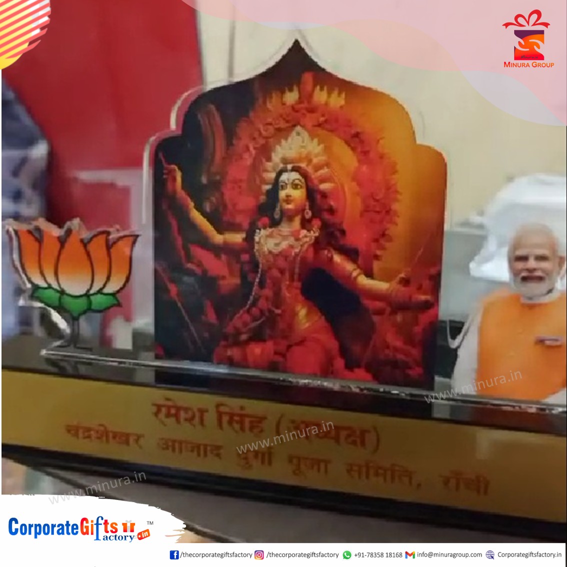 The momento was designed with Durga Mata’s image, Shri Narendra Modi Ji’s photo, and BJP Kamal symbol, reflecting the essence of devotion and celebration.