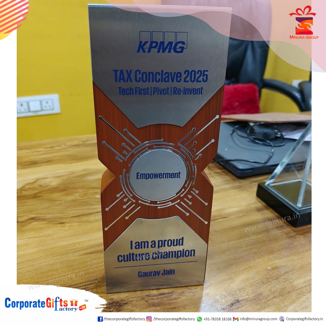 For KPMG’s Tax Conclave 2025, Minura Group designed and manufactured a bespoke corporate recognition trophy that blends modern aesthetics with meaningful symbolism.