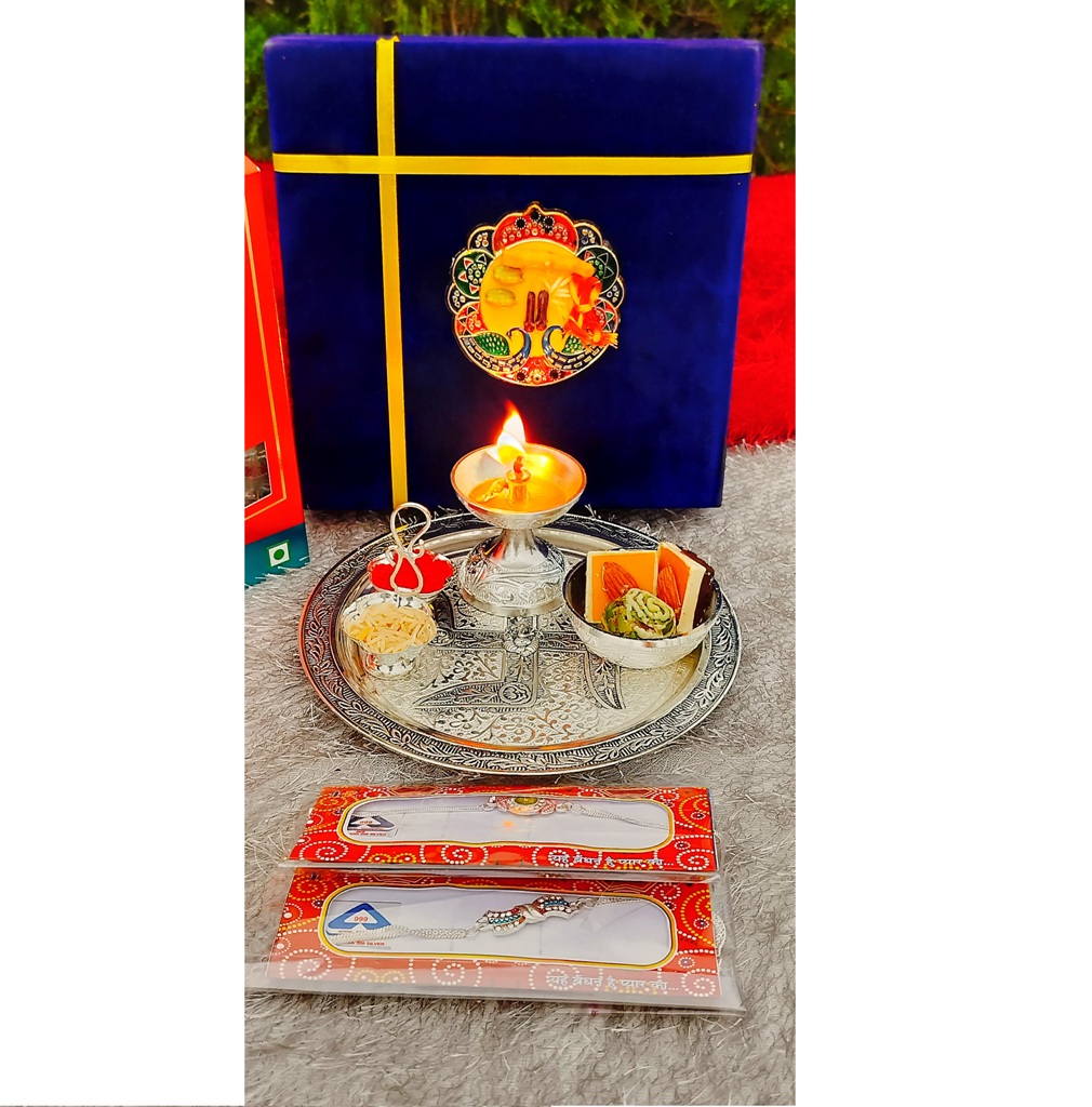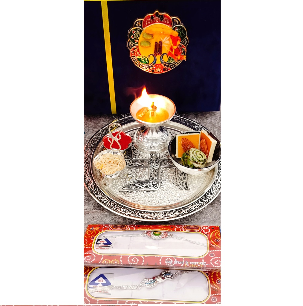 German Silver Swastik Ganesh Engraved Aarti Thali Set with 92.5 Silver Rakhi – Velvet Gift Box Pack