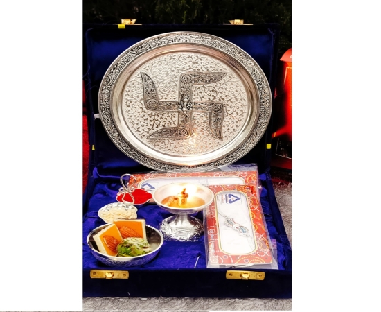 German Silver Swastik Ganesh Engraved Aarti Thali Set With Velvet Gift Box Pack - GRP2GSPD.3200.15260