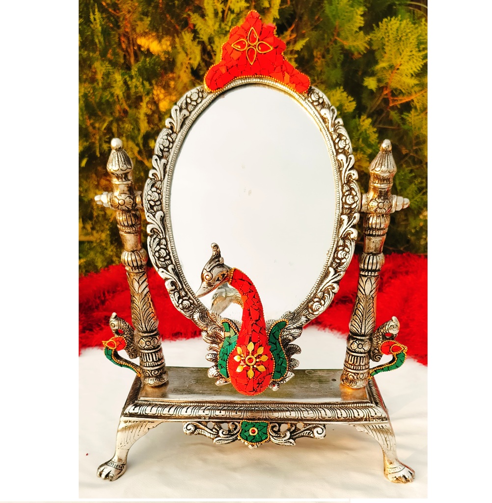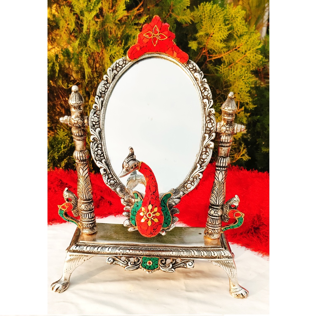 Add a royal charm to your space with this exquisite Antique German Silver Peacock Table Mirror, adorned with beautiful semi-precious stone work. Crafted with intricate peacock carving, this elegant table mirror serves as both a functional piece and a decorative masterpiece — perfect for enhancing any interior setting.