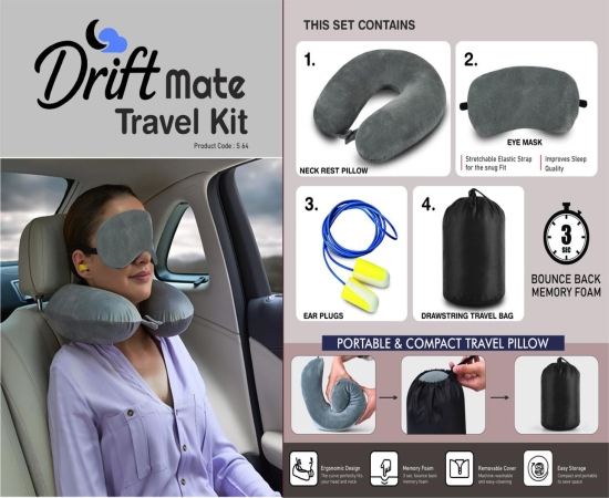 S64 – DriftMate Travel Kit: Combo of Memory foam Neck Rest Pillow, eye mask & ear plugs | With Drawstring Travel Bag