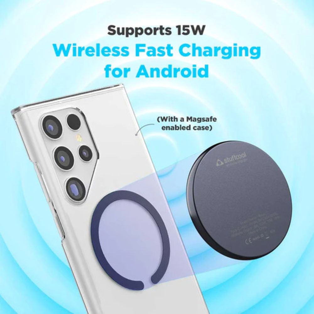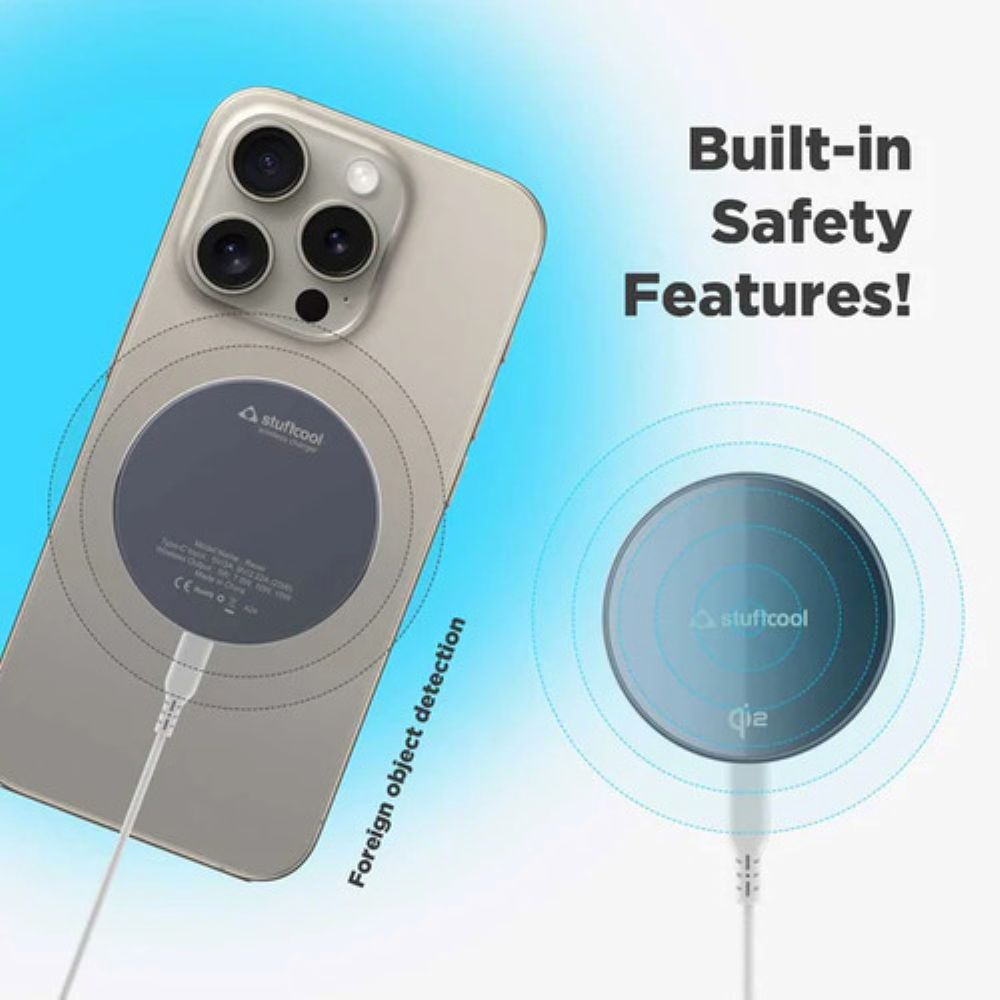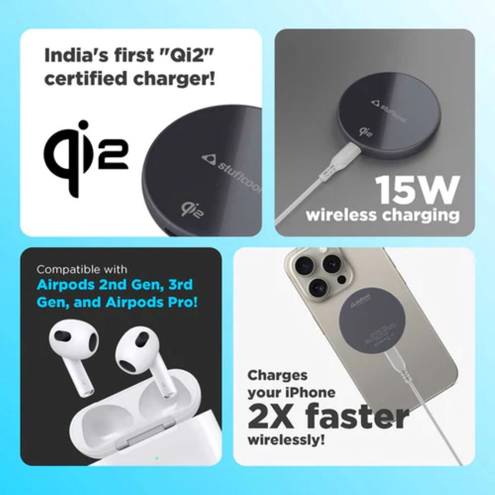 Experience next-gen charging with the Stuffcool Revel Qi2 Certified Magnetic Wireless Charger. With up to 15W fast wireless output and Qi2 certification, it delivers 2x faster charging for iPhones while staying sleek and durable with its aluminum housing. Engineered for convenience, it's MagSafe-compatible, works through cases up to 6.5mm, and includes a 20W Type-C PD wall charger and 3A Type-C to C cable. Compatible with iPhone 12 series and above, as well as AirPods models, it’s the perfect charging companion for Apple users.