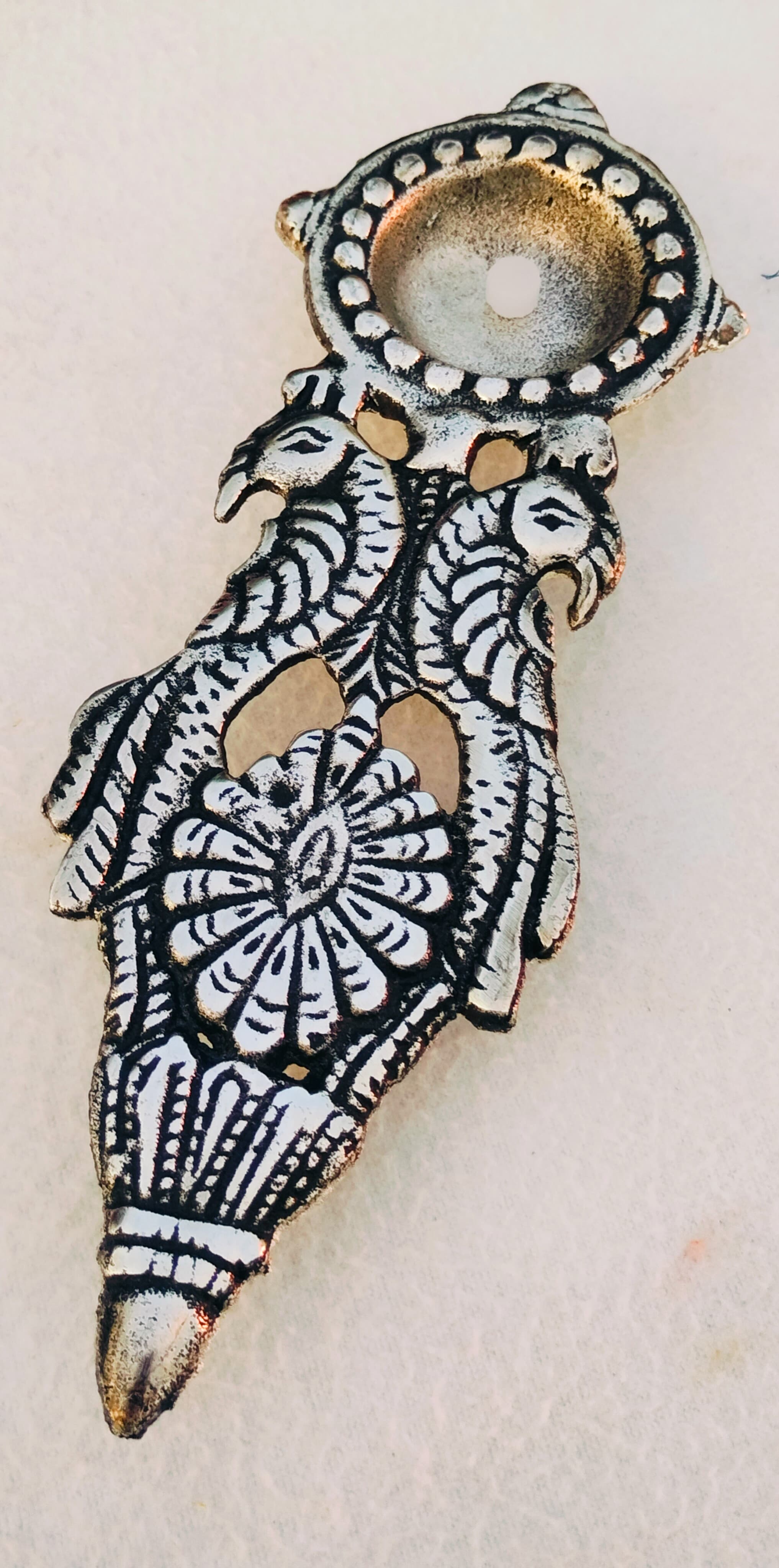 This Antique German Silver Aarthi Stand is a finely handcrafted pooja essential with an elegant antique finish. Its compact design makes it perfect for everyday rituals, home temples, and gifting.