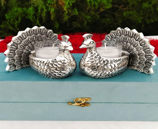 The Antique German Silver Exclusive Design Peacock Pair With Candle Holder GRP2GSPD.2900.GS41 is an elegant and traditional decorative piece, perfect for enhancing pooja setups, festive decorations, and gifting occasions. Crafted from premium-quality German silver, this candle holder features an exclusive design with a beautiful peacock pair that adds charm and cultural richness to any setting. The set includes detachable wax glass holders, making it easy to clean and reuse. The entire piece is washable and long-lasting, designed with both utility and aesthetics in mind. Packed in a velvet gift box, this peacock candle stand is an ideal choice for weddings, Diwali gifts, anniversaries, housewarmings, and religious ceremonies. Product Details Product Name: Antique German Silver Exclusive Design Peacock Pair With Candle Holder Product Code: GRP2GSPD.2900.GS41 Material: Premium Quality German Silver Finish: Antique Silver Look Design: Peacock Pair with Candle Holder Size: Height: 4.5" inch Width: 5" inch Features: Washable, Reusable, Detachable Wax Glass Holder Packaging: Packed in a premium velvet gift box Best Uses Ideal for pooja and religious ceremonies Traditional Diwali and festive decorations Elegant wedding, anniversary, and housewarming gift Decorative candle holder for homes, temples, and offices Corporate gifting during festivals