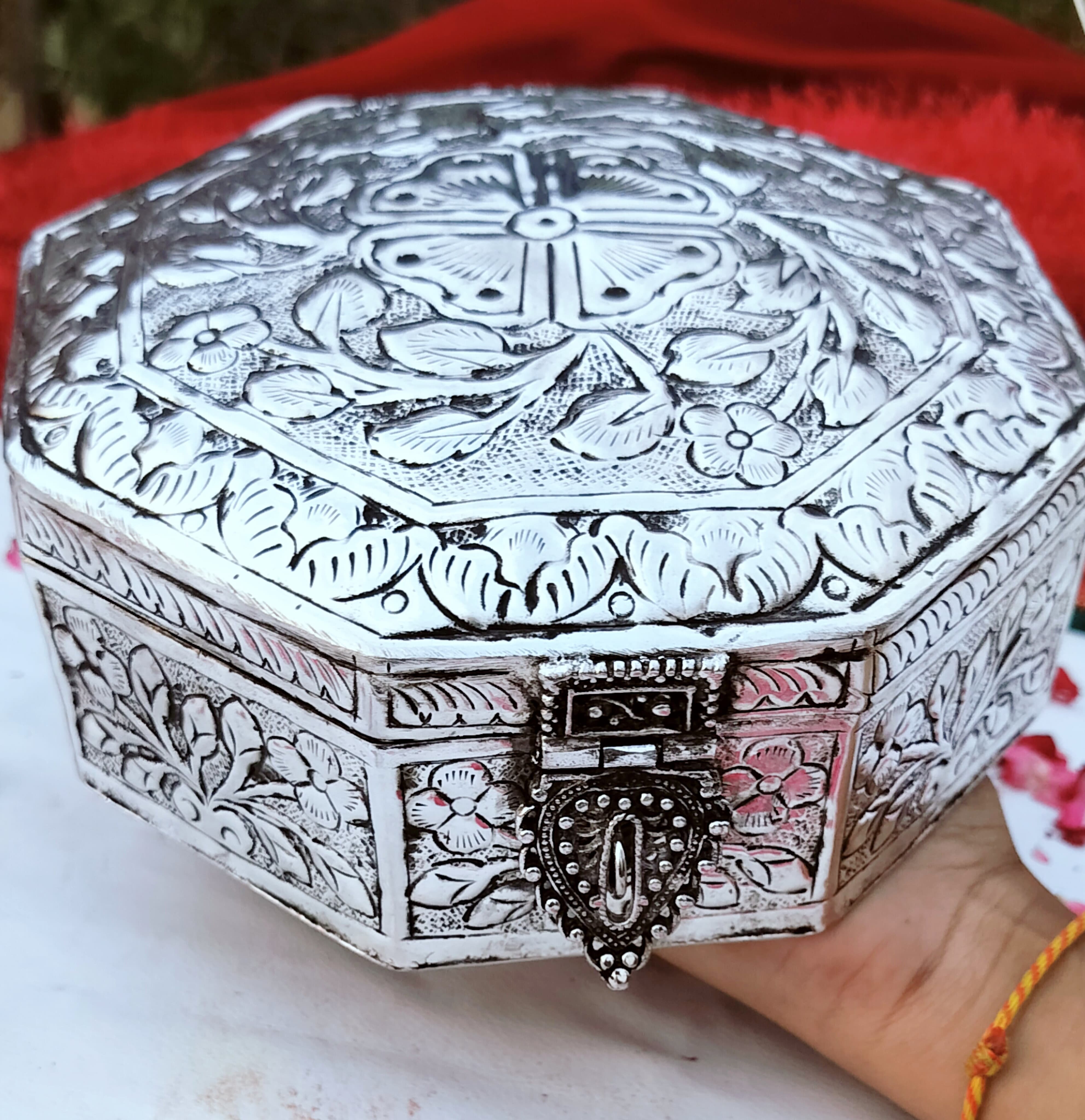 The Antique German Silver Heavy Gauge Dry Fruit Box is a premium handcrafted storage box designed with strength, elegance, and tradition. Made from thick heavy gauge German Silver, it ensures long-lasting durability and a luxurious finish.