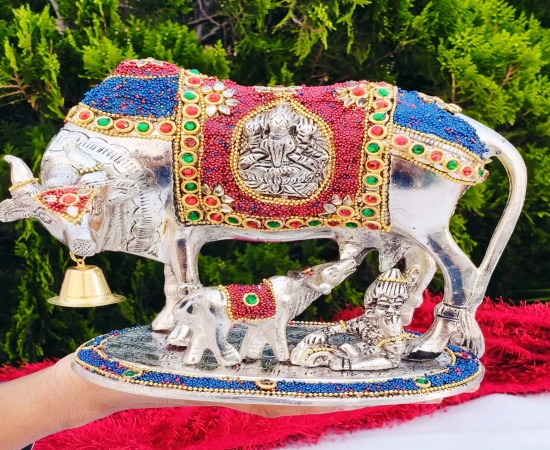 The Antique German Silver Cow Calf Set is a beautifully handcrafted devotional piece, symbolizing purity, motherhood, and prosperity. Representing Kamdhenu (the holy cow) along with her calf, this set is considered highly auspicious in Indian tradition and is believed to bring blessings of wealth, health, and happiness. Made from premium quality German Silver with an antique finish, this cow calf idol is further decorated with intricate stone work, enhancing its divine beauty. With a size of 8.5" length and 6" height, it is a perfect addition to your pooja room, temple, or home décor. This sacred set is ideal for daily worship, Diwali puja, Navratri, and housewarming ceremonies. It also makes a meaningful gift for weddings, anniversaries, and festive occasions. Durable, washable, and timeless in design, this cow calf idol is a true symbol of tradition and spirituality. Product Details Product Name: Antique German Silver Cow Calf Set with Stone Work Product Code: GRP2GSPD.2750.GS55 Material: Premium German Silver Finish: Antique Silver Look with Stone Work Size: Length – 8.5" | Height – 6" Features: Durable, Washable, Handcrafted Stone Work Design Packaging: Secure Box Packing Best Uses Pooja Room / Temple Idol Festive Puja – Diwali, Navratri, Govardhan Puja Housewarming & Wedding Gift Corporate Festive Gifting Decorative spiritual showpiece for home or office