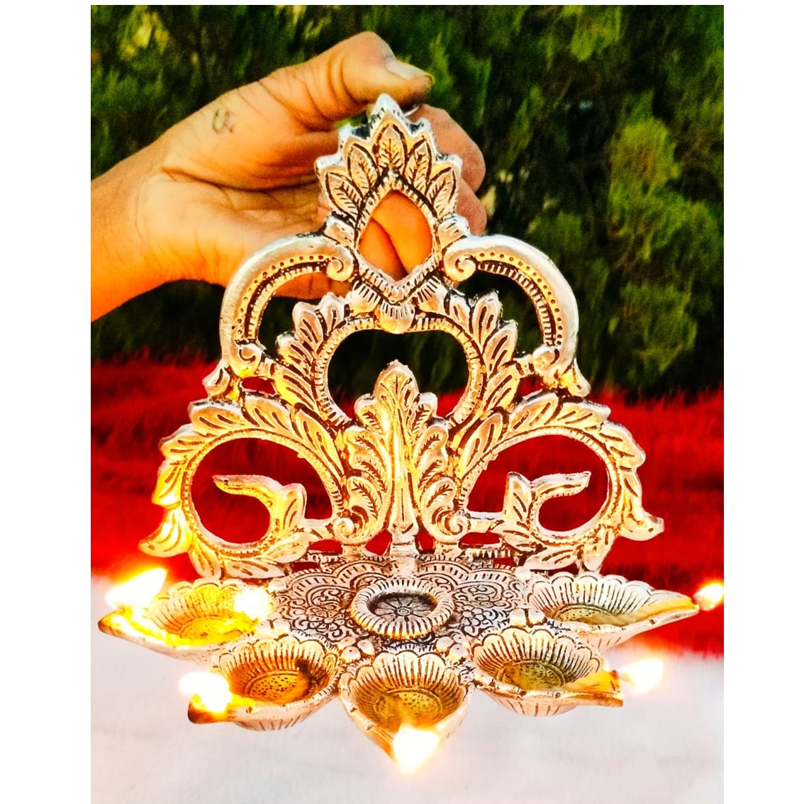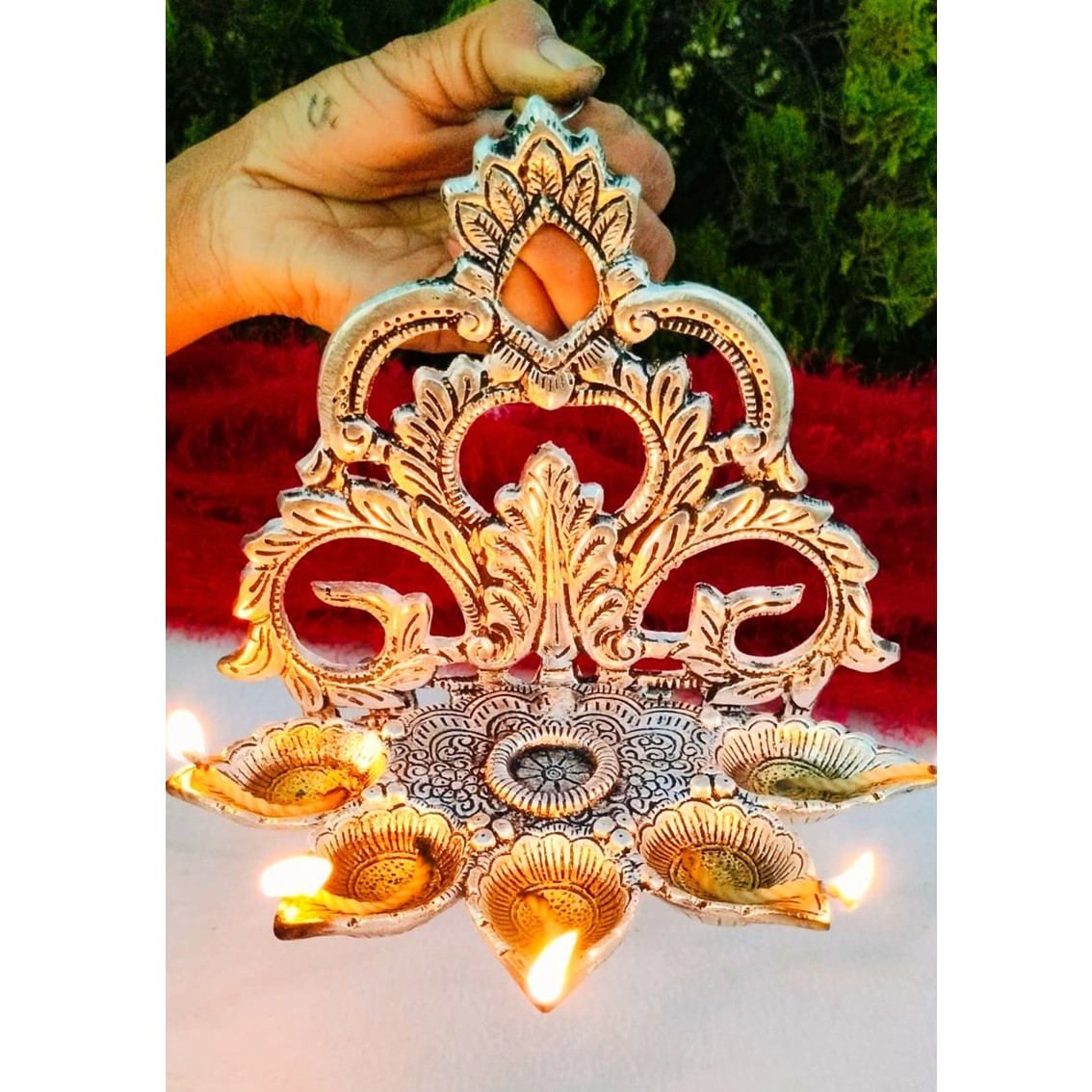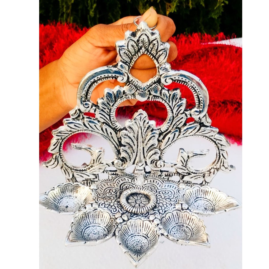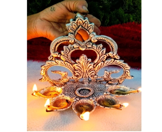 Antique German Silver Big Size Hanging Panchmukhi Diya GRP2GSPD.1100.GS19 Bring a divine aura to your home or temple with this **Antique German Silver Panchmukhi Hanging Diya**. Crafted with a beautiful **exclusive arch pattern design**, this big-size diya is perfect for daily rituals, festivals, or temple décor. The five wicks (Panchmukhi) symbolize prosperity, positivity, and spiritual energy, making it an auspicious addition to your pooja room. **Product Details:** * Material: German Silver with antique finish * Design: Hanging Panchmukhi Diya with exclusive arch pattern * Size: Height – 9" inch | Width – 7.5" inch * Ideal for: Pooja, temples, festive decorations, return gifts, and traditional ceremonies This elegant diya is not only a spiritual essential but also a timeless piece of art, enhancing the décor with its antique charm.