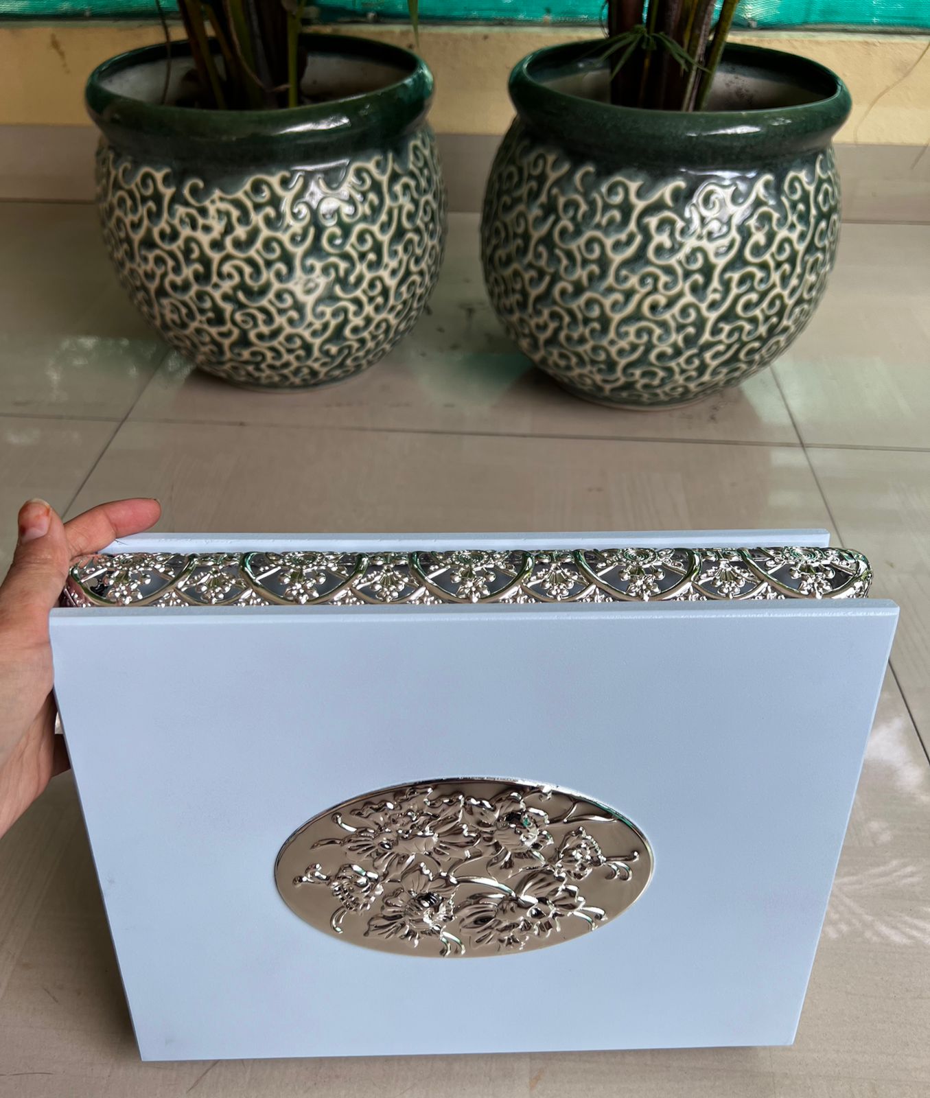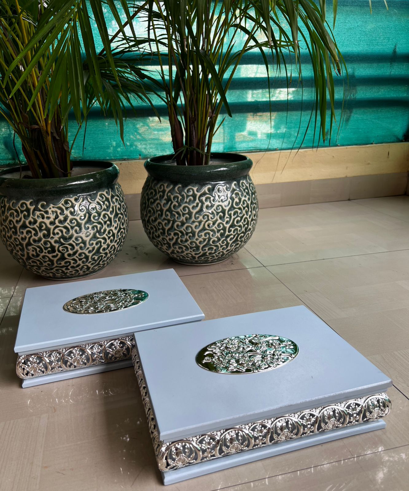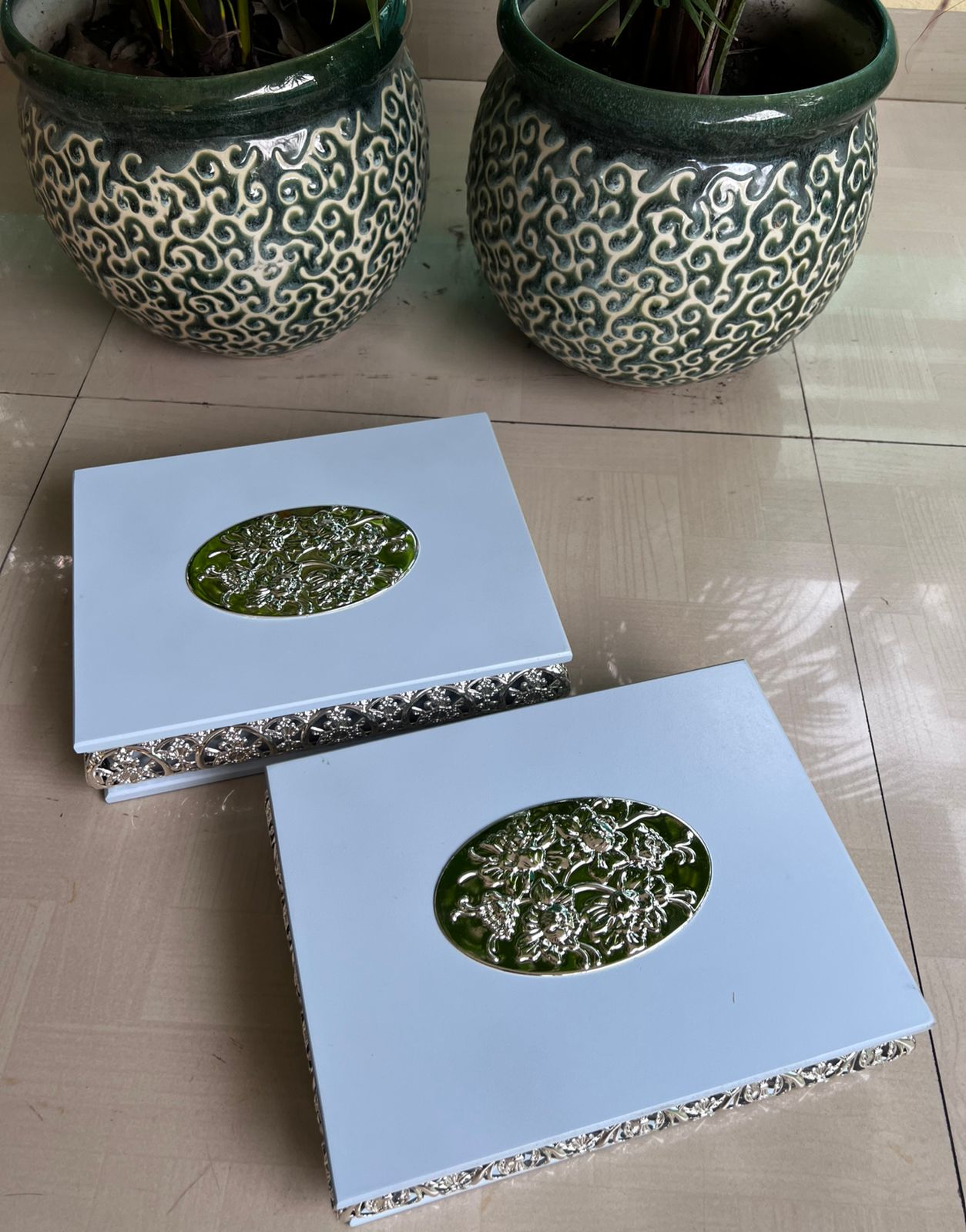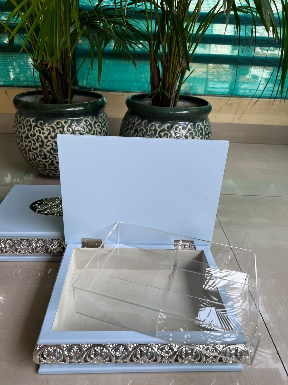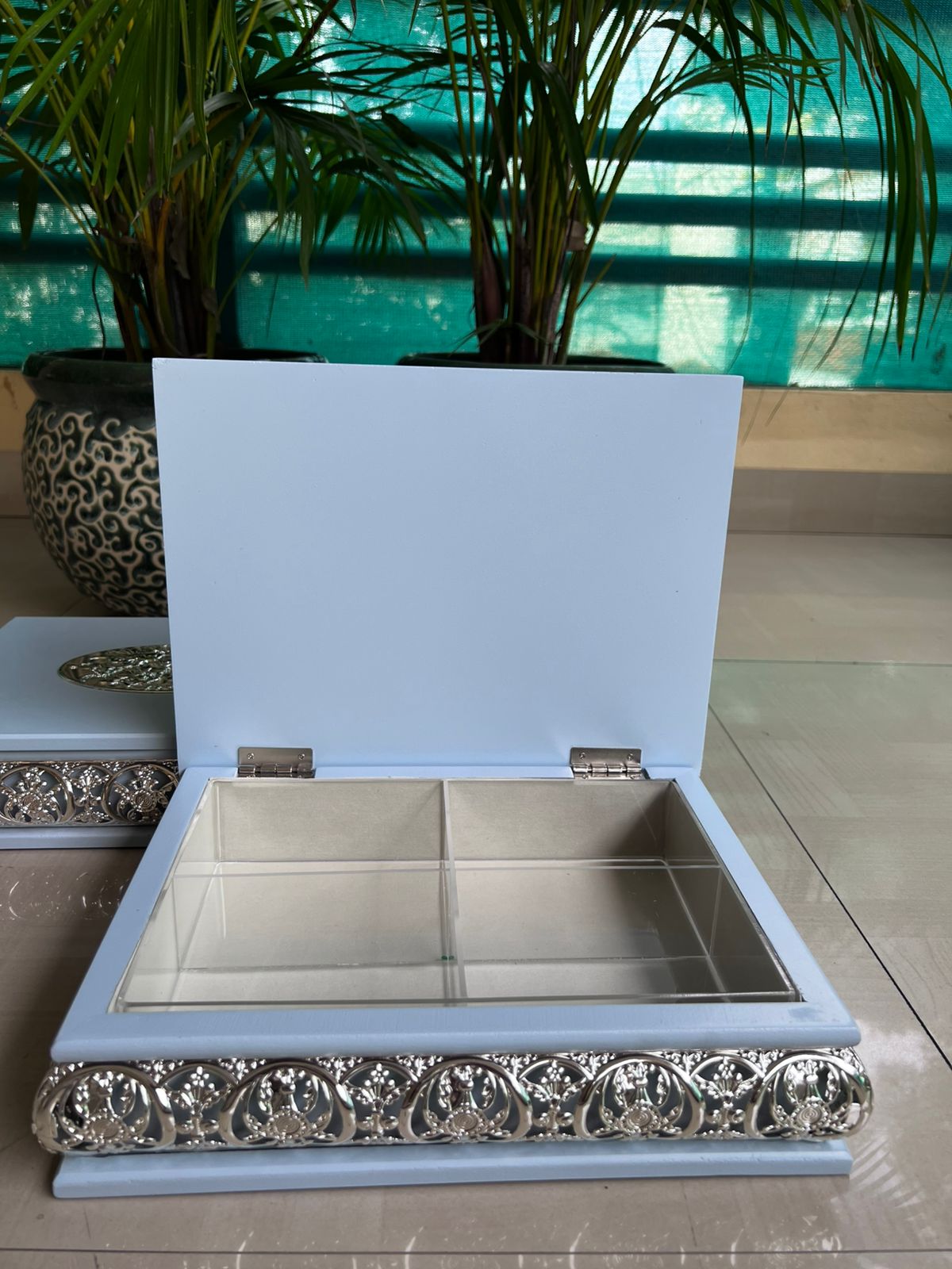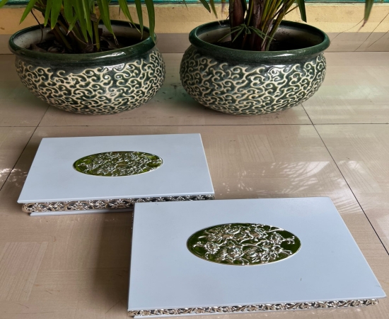 Enhance your gifting and storage experience with this beautiful German Silver Jhaali work wooden dry fruit box. Crafted with precision and elegance, this imported wooden box features intricate German Silver detailing, adding a touch of traditional charm and luxury to your home or office. Material: High-quality wood with imported German Silver Jhaali work Design: Exquisite handcrafted lattice (Jhaali) pattern for a sophisticated look Partitioned Interior: Convenient multi-compartment design to neatly store dry fruits, nuts, or sweets Size: 11.5 x 9 x 3 inches – perfect for gifting or personal use Durability: Strong wooden construction ensures long-lasting use Occasion: Ideal for Diwali, weddings, corporate gifts, festivals, and special occasions Make gifting memorable with this premium German Silver dry fruit box, combining functionality with artistic elegance. Perfect for presenting dry fruits, chocolates, or other treats in style.