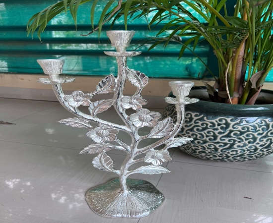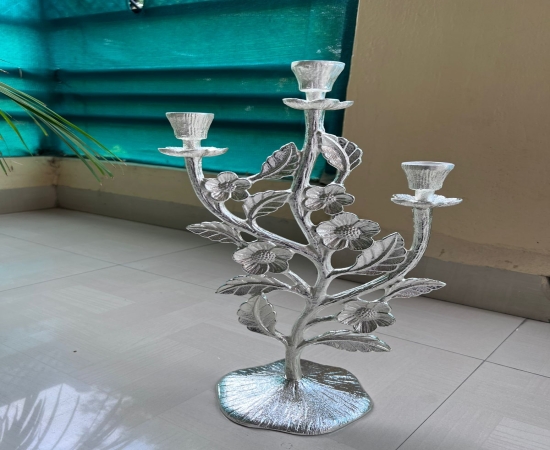 This 3-candle stand is designed to hold pillar or taper candles securely, offering both functional lighting and decorative appeal. Its sleek silver finish not only complements modern and contemporary interiors but also adds a touch of classic charm to traditional settings. Ideal for festive occasions, romantic dinners, weddings, or as a luxurious gift, this candle holder brings warmth and elegance to every environment.