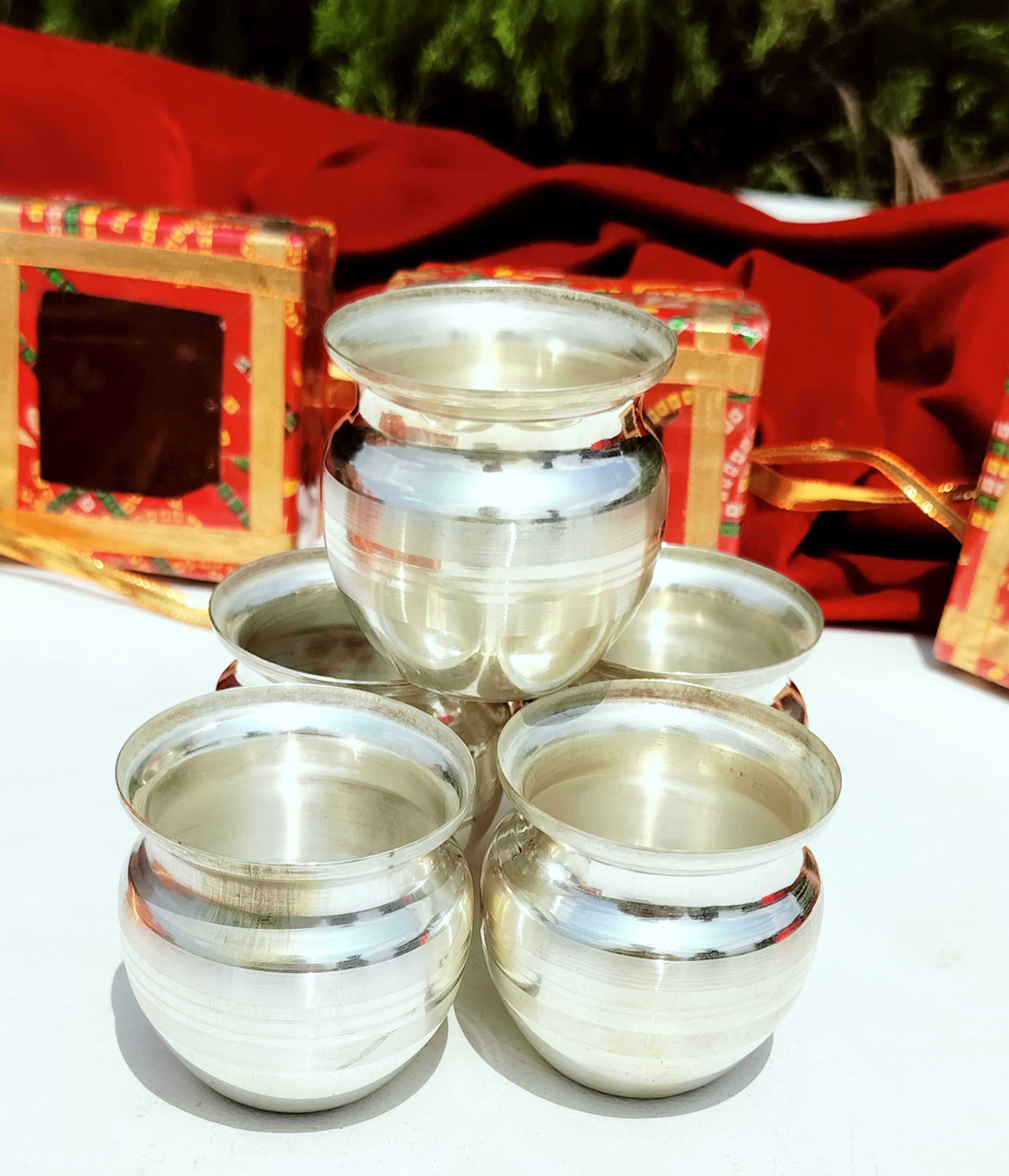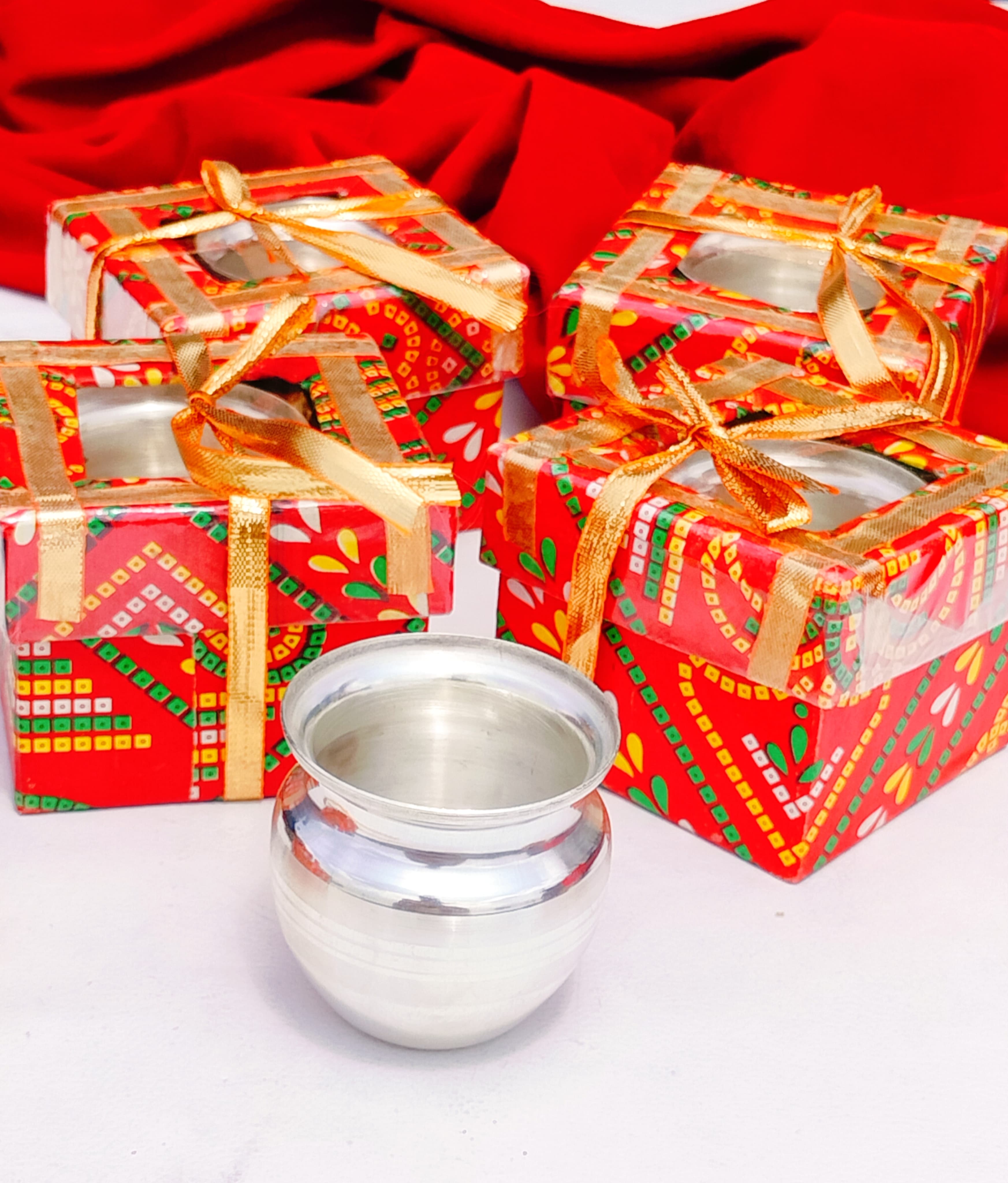 Each Kalash is carefully packed in a Chunari Gift Box, adding a festive and traditional touch, which enhances its value as a return gift. This makes it a perfect choice for Karwa Chauth, Navratri, Diwali, wedding ceremonies, housewarming functions, baby showers, and other auspicious occasions.