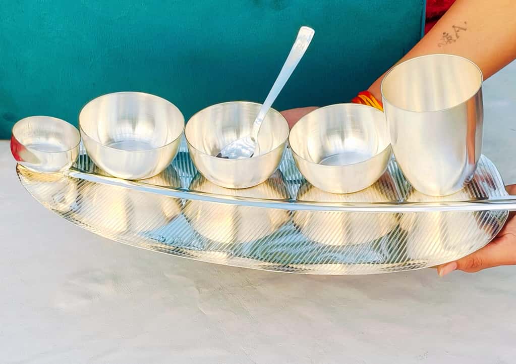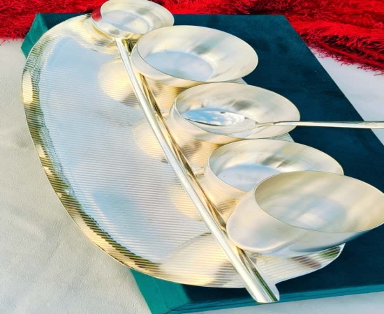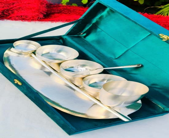 Crafted from high-quality German silver, the dinner set is durable, elegant, and perfect for both everyday use and special events. The set is thoughtfully curated to include all essentials for a complete meal while making a sophisticated presentation. Each set is packed in a velvet gift box, making it a perfect luxury gift for family, friends, or corporate clients.