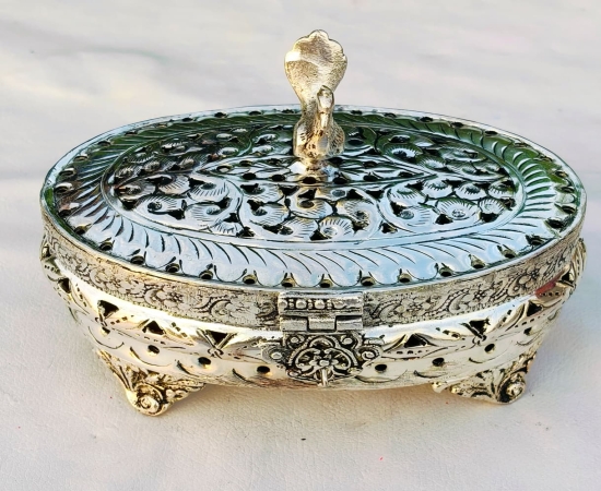 The German Silver Oval Dry Fruit Box with Peacock Head is a beautifully crafted storage box designed for serving and gifting dry fruits, sweets, and mouth fresheners. Featuring an elegant oval shape with a peacock head design on the lid, this box combines tradition with utility, making it perfect for festive gifting and home décor. Made from high-quality German Silver with an antique finish, this box is durable, reusable, and easy to maintain. Its compact 5.5" x 4" size makes it suitable for storing dry fruits, nuts, chocolates, or even as a decorative keepsake box. Ideal for Diwali, weddings, anniversaries, return gifts, and festive occasions, this dry fruit box adds a touch of luxury to your celebrations. Product Details Product Name: German Silver Oval Dry Fruit Box with Peacock Head – Small Size Product Code: GRP2GSPD.3500.GS45 Material: Premium Quality German Silver Design: Oval Shape with Peacock Head Lid Size: 5.5" x 4" inch Finish: Antique Silver Look Uses: Dry Fruits, Sweets, Chocolates, Mukhwas, Decorative Storage Features: Durable, Reusable, Washable Packaging: Comes in a safe box packing Best Uses Dry fruit and sweet storage Diwali and festive gifting Wedding and anniversary return gifts Housewarming and corporate gifts Decorative tableware for special occasions