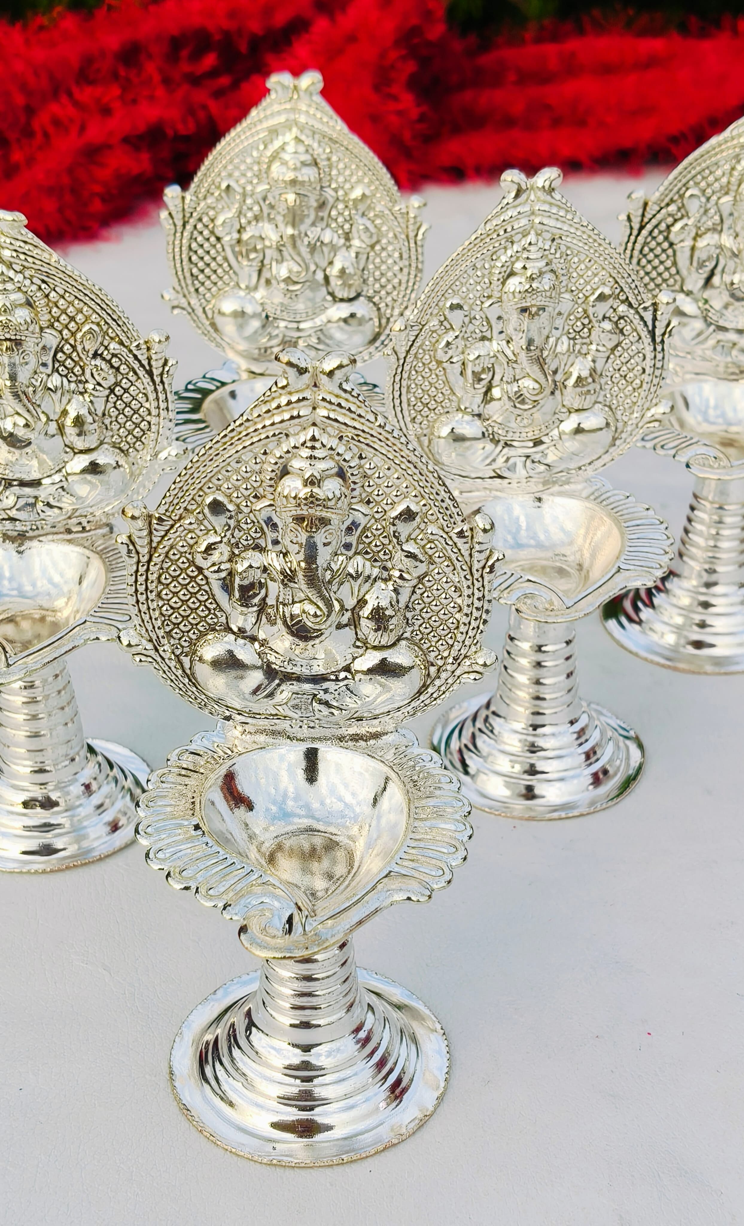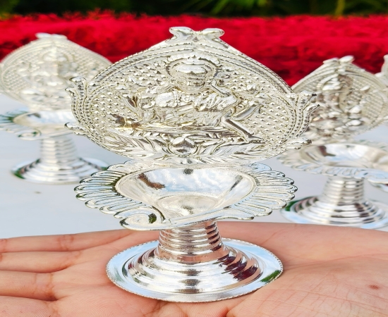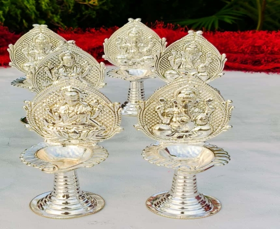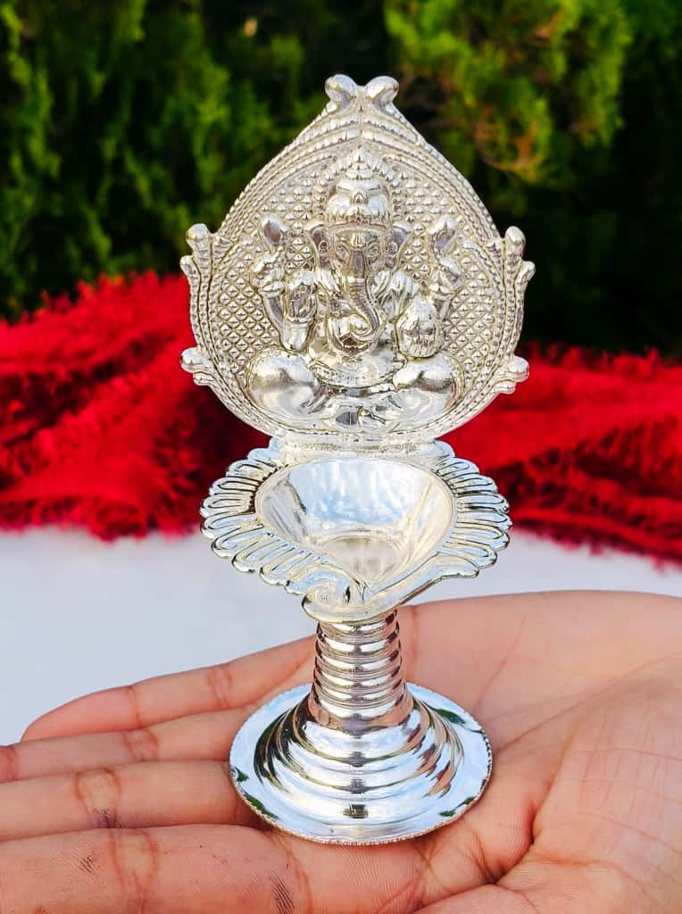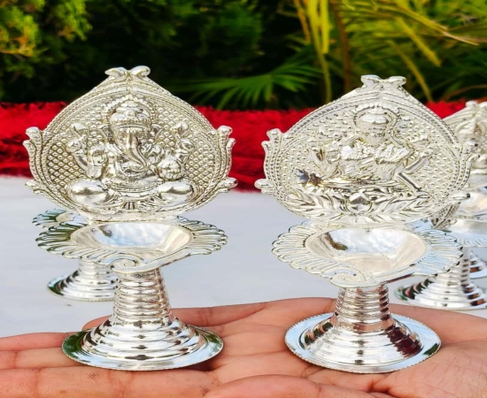 The German Silver Shankh Design Laxmi & Ganesh Diya is a beautifully handcrafted diya symbolizing spirituality, prosperity, and devotion. Designed in the shape of a sacred shankh (conch shell), it features detailed engravings of Goddess Laxmi and Lord Ganesh, making it an auspicious choice for pooja rituals and festive décor. Made from premium quality German Silver, this diya has an elegant antique finish and a compact size of 5 inches, making it perfect for daily puja, Diwali aarti, Navratri rituals, and other religious ceremonies. It is also considered a lucky gifting option for weddings, anniversaries, and housewarming occasions. Durable, washable, and reusable, this diya is not just a pooja essential but also a decorative piece that enhances the spiritual aura of your home or temple. Product Details Product Name: German Silver Shankh Design Laxmi & Ganesh Diya Product Code: GRP2GSPD.240.GS51 Material: Premium German Silver Design: Shankh Style with Laxmi & Ganesh Engraving Size: 5" inch Finish: Antique Silver Look Features: Durable, Washable, Handcrafted Traditional Design Packaging: Secure Box Packing Best Uses Ideal for Daily Pooja and Aarti Festive Diwali & Navratri Gifting Wedding & Housewarming Gift Enhances spiritual décor at home or office mandir Perfect for corporate festive gifts