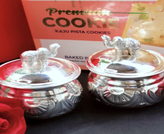 Add a touch of elegance to your festive gifting with the German Silver Handi Shape Dry Fruits Bowl Set (GRP2GSPD.2100.GS67). Designed with traditional artistry, this set includes two beautifully crafted handi bowls with elephant design lids, symbolizing prosperity, strength, and auspiciousness. Perfect for serving or gifting during festivals and special occasions.