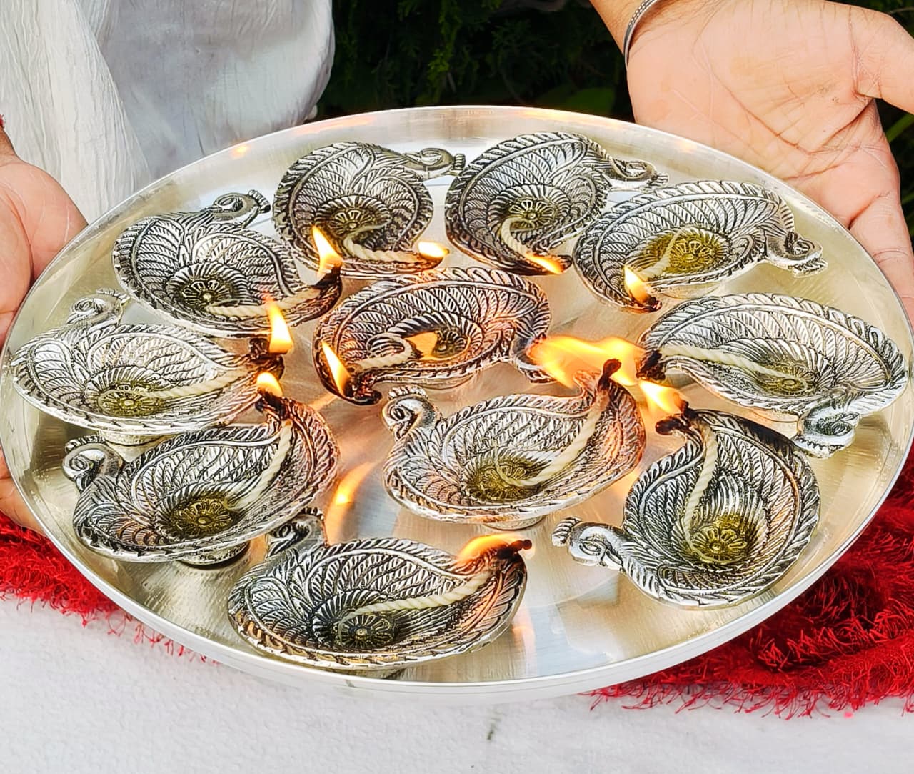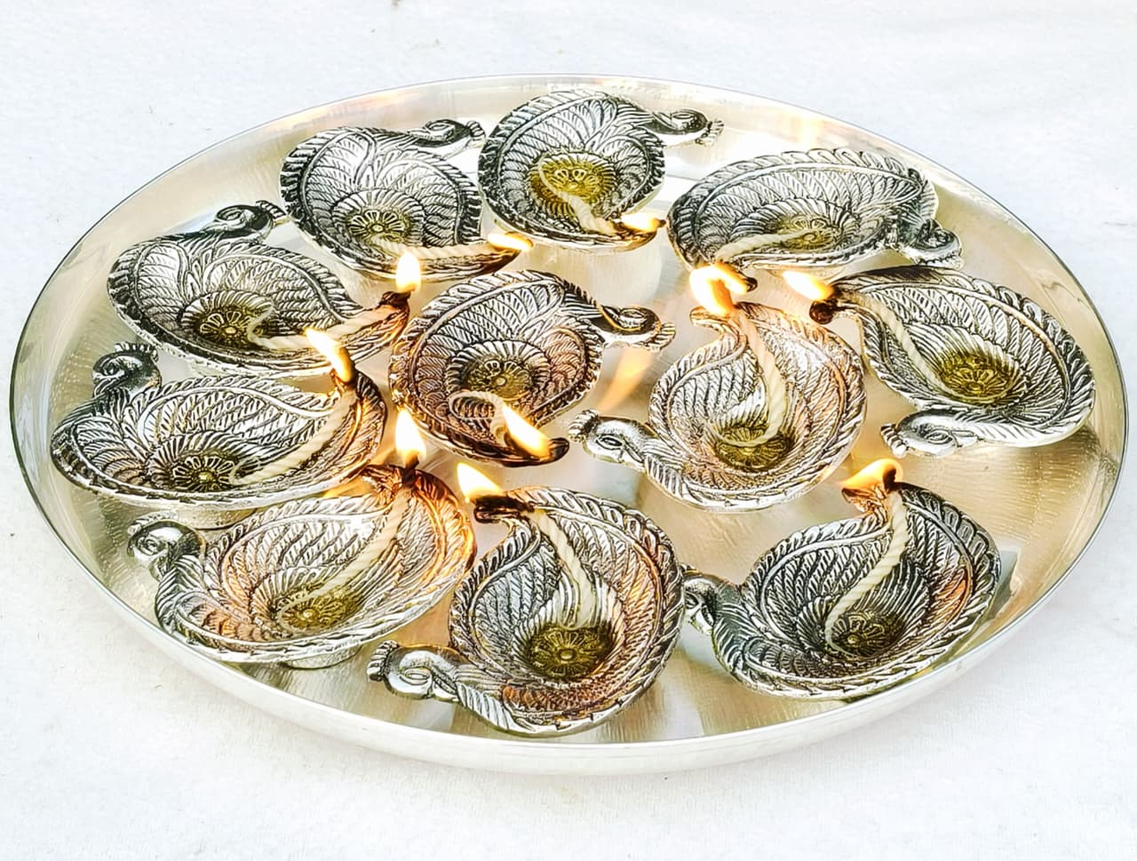German Silver Big Size Mayur Design 11 Diya With Thali MAHALAKSHMI Aarti Thali Set GRP2GSPD.3100.GS73