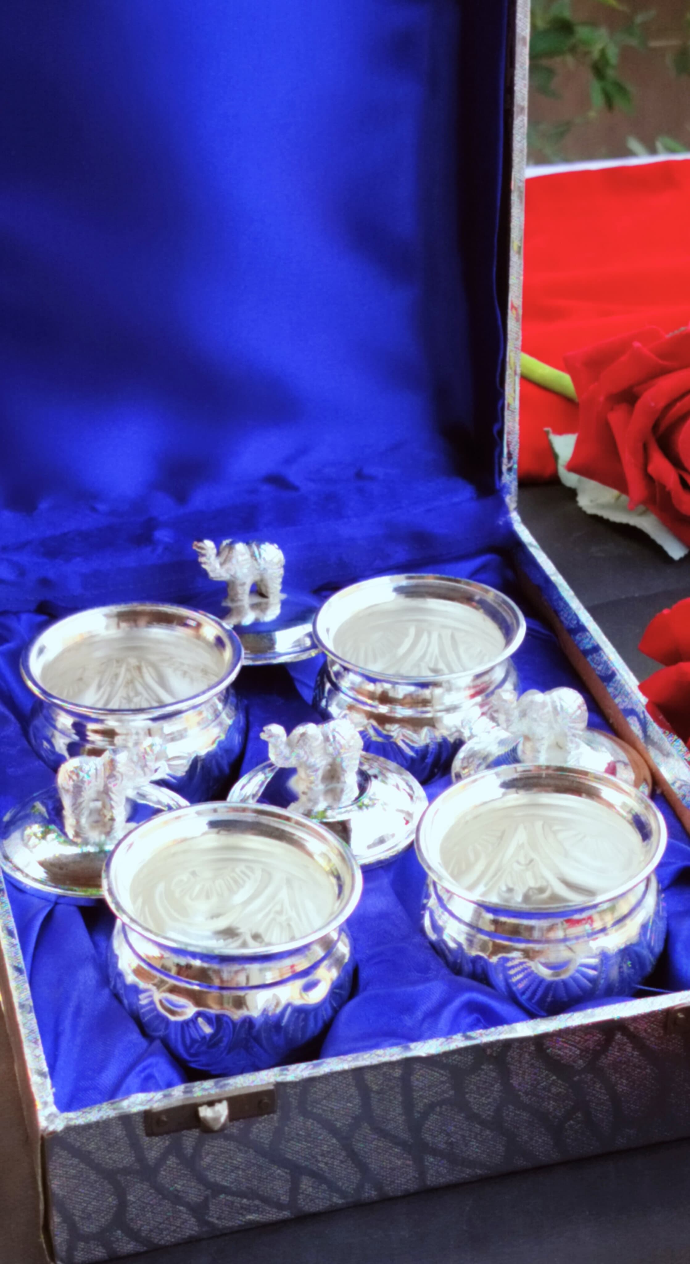 Make your festive gifting special with the German Silver 4 Handi Shape Dry Fruit Bowl Set (GRP2GSPD.3400.GS68). This luxurious set comes with four beautifully designed handi bowls with elephant design lids, symbolizing prosperity and tradition. Packed in a premium velvet box, it is the perfect choice for festivals, weddings, and corporate gifting.