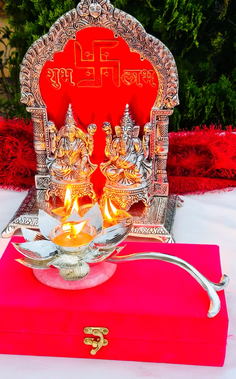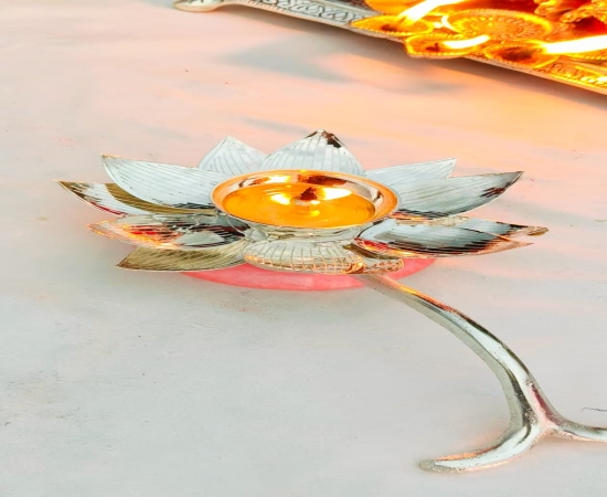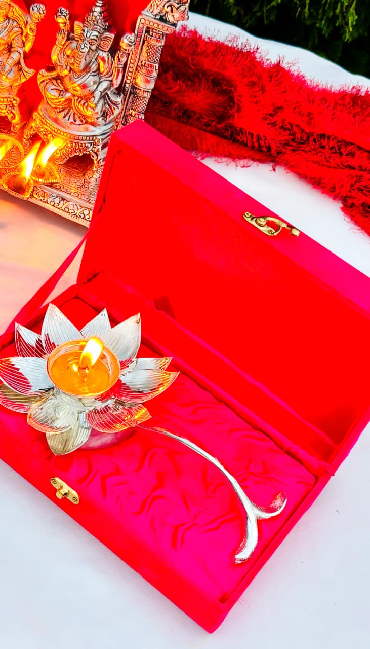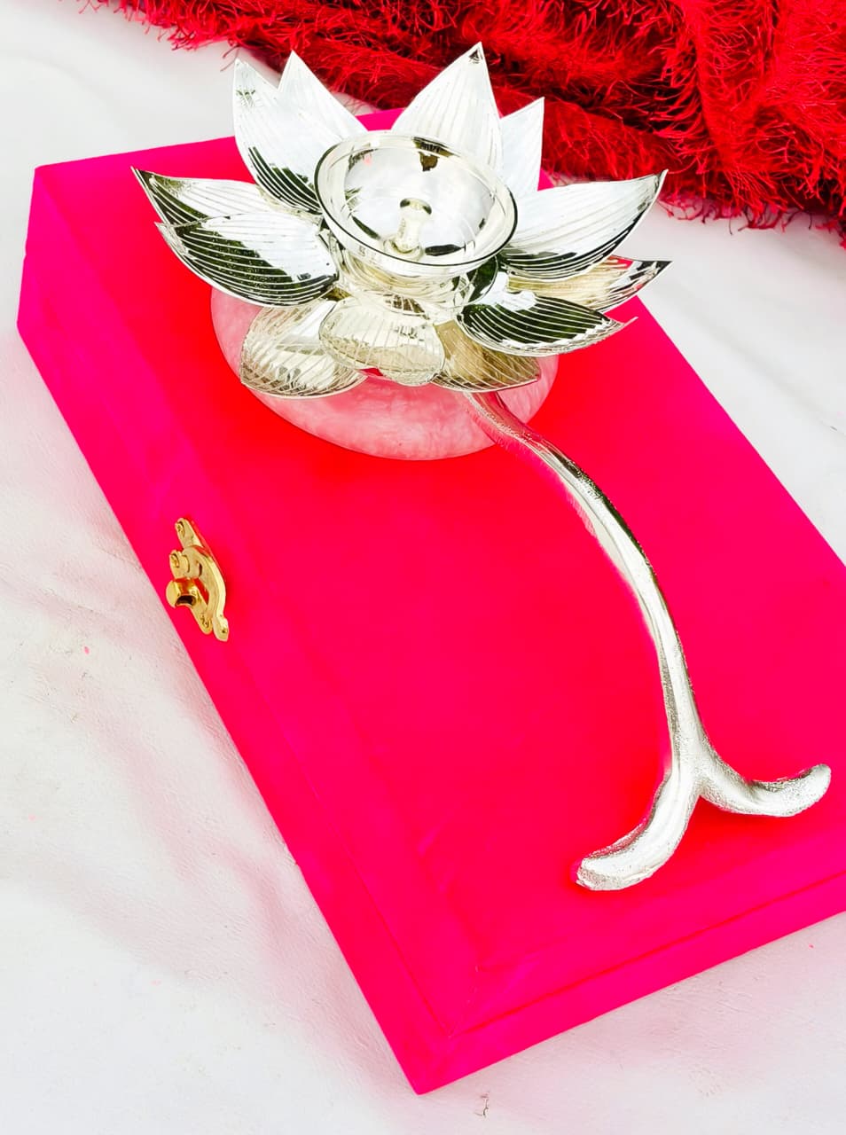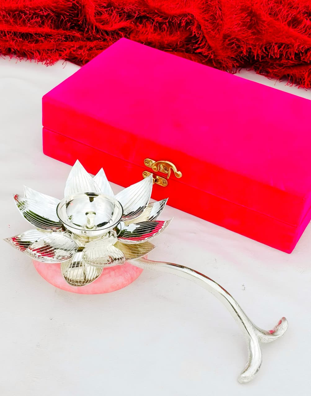 This elegant German Silver Lotus Handle Diya comes with a beautifully crafted pink resin base and a luxurious pink velvet gift box. Designed with 12 petals in a heavy-gauge lotus style, this premium-quality aarti diya is perfect for puja rituals, temple use, festive décor, and gifting. With a size of 9 inches length and 5 inches width, it offers a traditional yet stylish appeal for auspicious occasions. Key Features: German Silver Lotus Handle Diya with Pink Resin Base Heavy Quality 12 Petals Heavy Gauge Lotus Aarti Diya Size: Length – 9 inches, Width – 5 inches Packed in a Pink Velvet Gift Box for a premium look Ideal for puja, temple décor, housewarming, Diwali, and gifting German Silver Lotus Handle Diya, German Silver Aarti Diya, Heavy Gauge Lotus Diya, 12 Petal Lotus Handle Diya, German Silver Diya with Resin Base, Pink Resin Base Silver Diya, Premium German Silver Pooja Diya, German Silver Lotus Diya Gift, Silver Finish Lotus Handle Aarti Diya, German Silver Diya with Velvet Box, Temple Pooja Lotus Diya, German Silver Diya for Diwali, Traditional Lotus Diya in German Silver, Decorative Lotus Aarti Diya, German Silver Housewarming Gift Diya