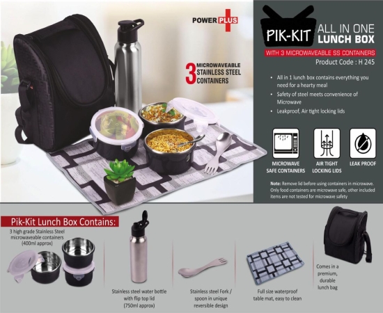 H245 – PIK-KIT: All in 1 Lunch box with 3 Microwaveable Steel containers | Contains SS bottle, Fork, Spoon, Tablemat, Premium Bag