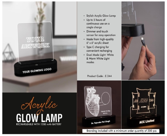 E344 – Acrylic Glow Lamp – Rechargeable| 1200 mAh battery| White & Warm white light| Dimmer & Touch Sensor| 6 x 6″ Acrylic sheet| Type C charging| Branding Included