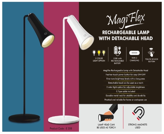 E358 – MagiFlex: Rechargeable Lamp with Detachable Head | 3 color light | Detachable head to use as torch | Durable metal neck