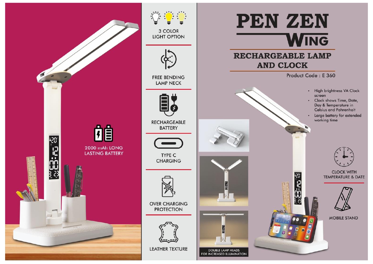 E360 – PenZen Wing: Rechargeable lamp with Dual tumbler | Clock with Temperature & Date | Double Lamp Heads | Phone stand function | 2000 mAh battery for long working time