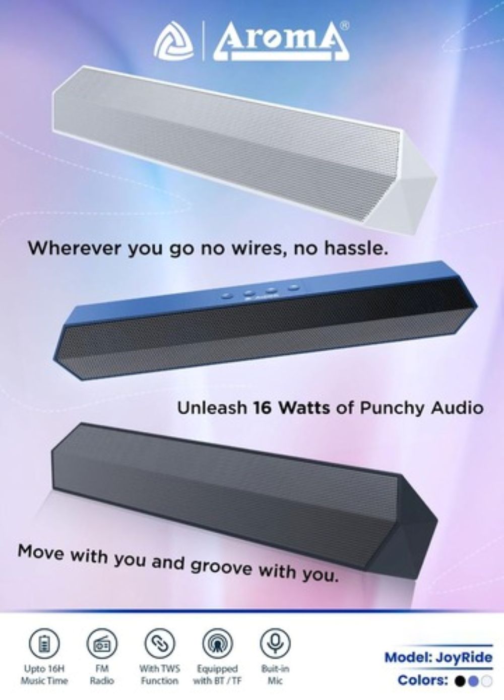 Experience immersive sound on the go with the Aroma Joyride SoundBar. Designed for those who love powerful audio in a sleek package, this 16W portable soundbar offers up to 16 hours of playtime, perfect for extended listening sessions. Whether you're tuning into FM radio, streaming via Bluetooth, or using the TF card slot, the Joyride adapts to your vibe. Enjoy enhanced stereo sound with the TWS (True Wireless Stereo) function and stay connected with the built-in microphone for hands-free calls. Compact, versatile, and performance-packed — the Joyride SoundBar is your go-to audio companion.