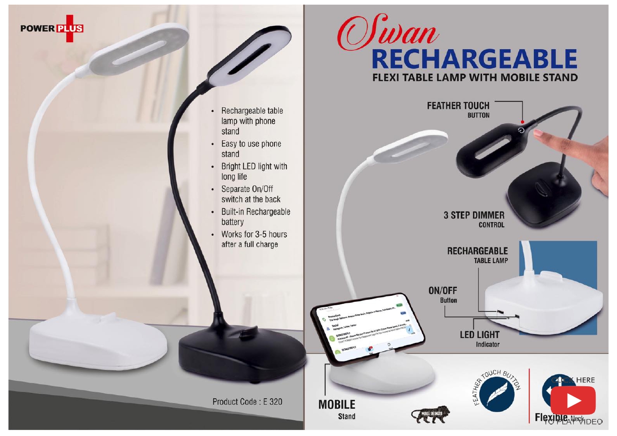 E320 – Rechargeable Flexi table lamp with Mobile stand | 3 step dimmer control | Feather Touch button