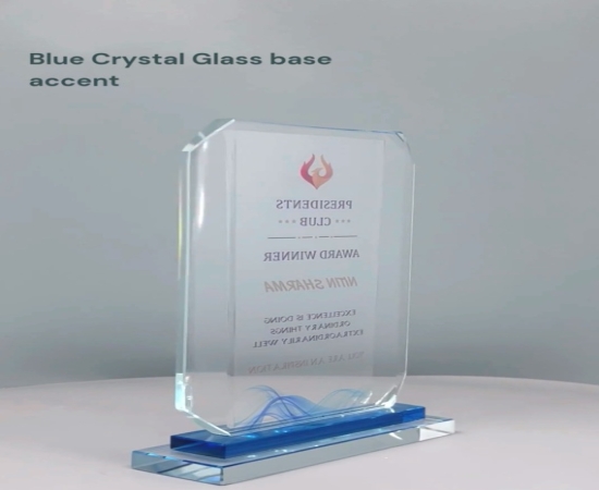 Designed with a modern vertical shape and solid crystal base, it features beveled edges that catch and reflect light beautifully. The flat surface area allows for easy customization — perfect for laser engraving, UV printing, or sandblasting your company logo, award title, recipient name, and personalized message.