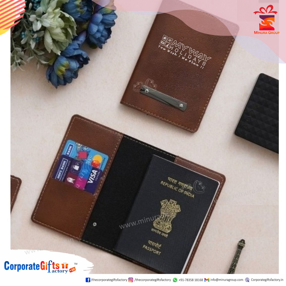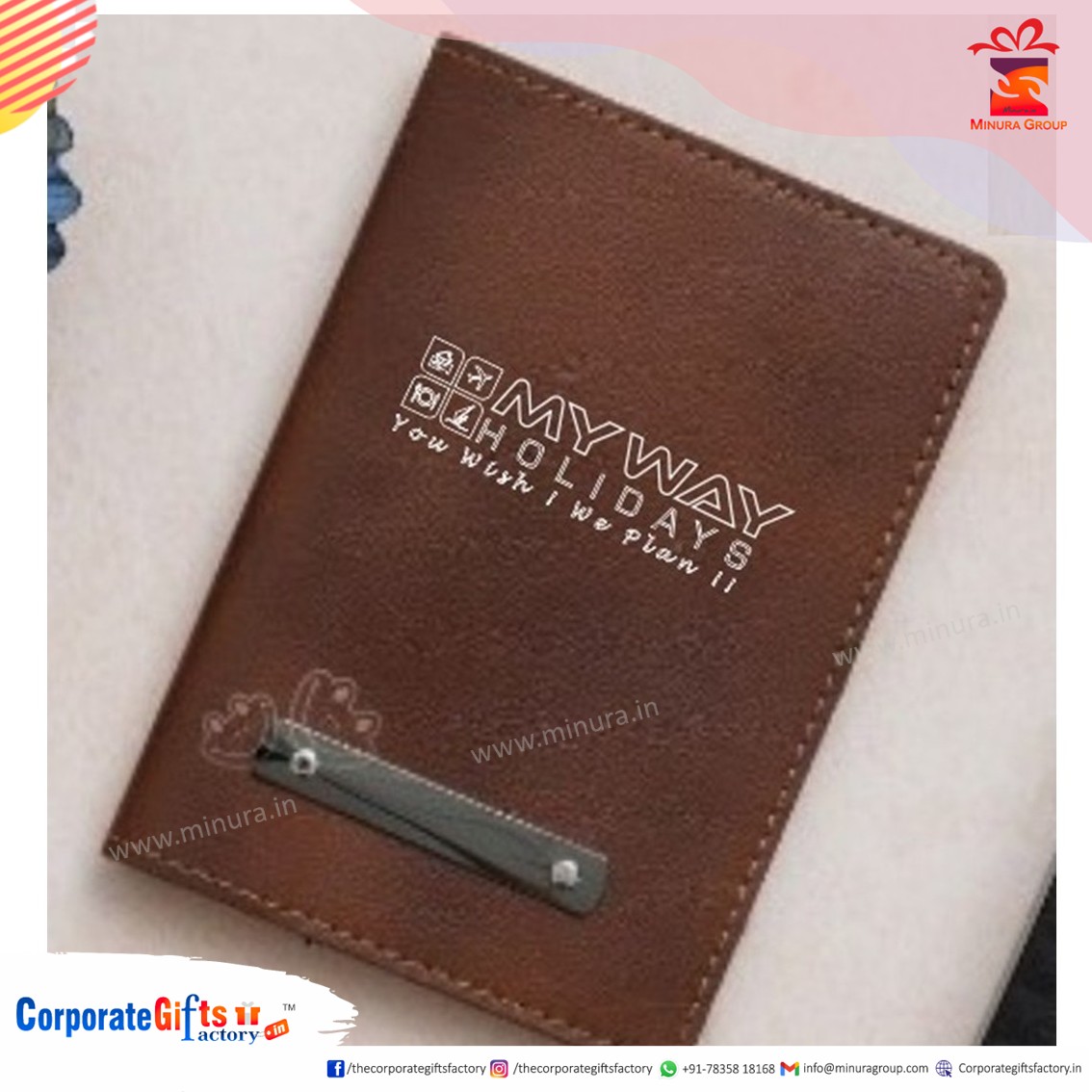 Minura Group presents premium PU (Vegan) Leather Passport Holders, customised specially for My Way Holidays. These passport holders are crafted from high-quality vegan leather and designed to offer durability, elegance, and travel convenience.