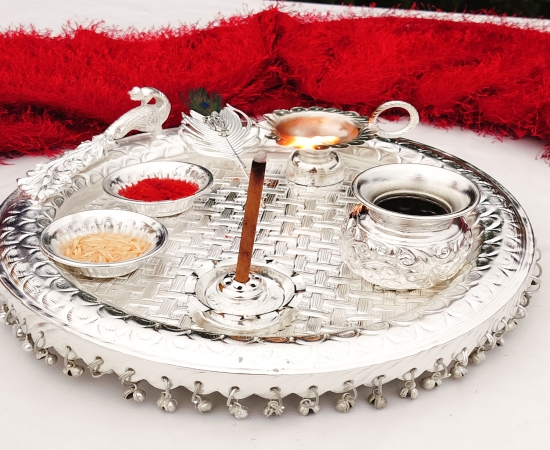 German Silver Peacock Engraved Pure Silver Finish Heavy Gauge Ghungaru Aarti Thali Set GRP2GSPD.5500.GS71