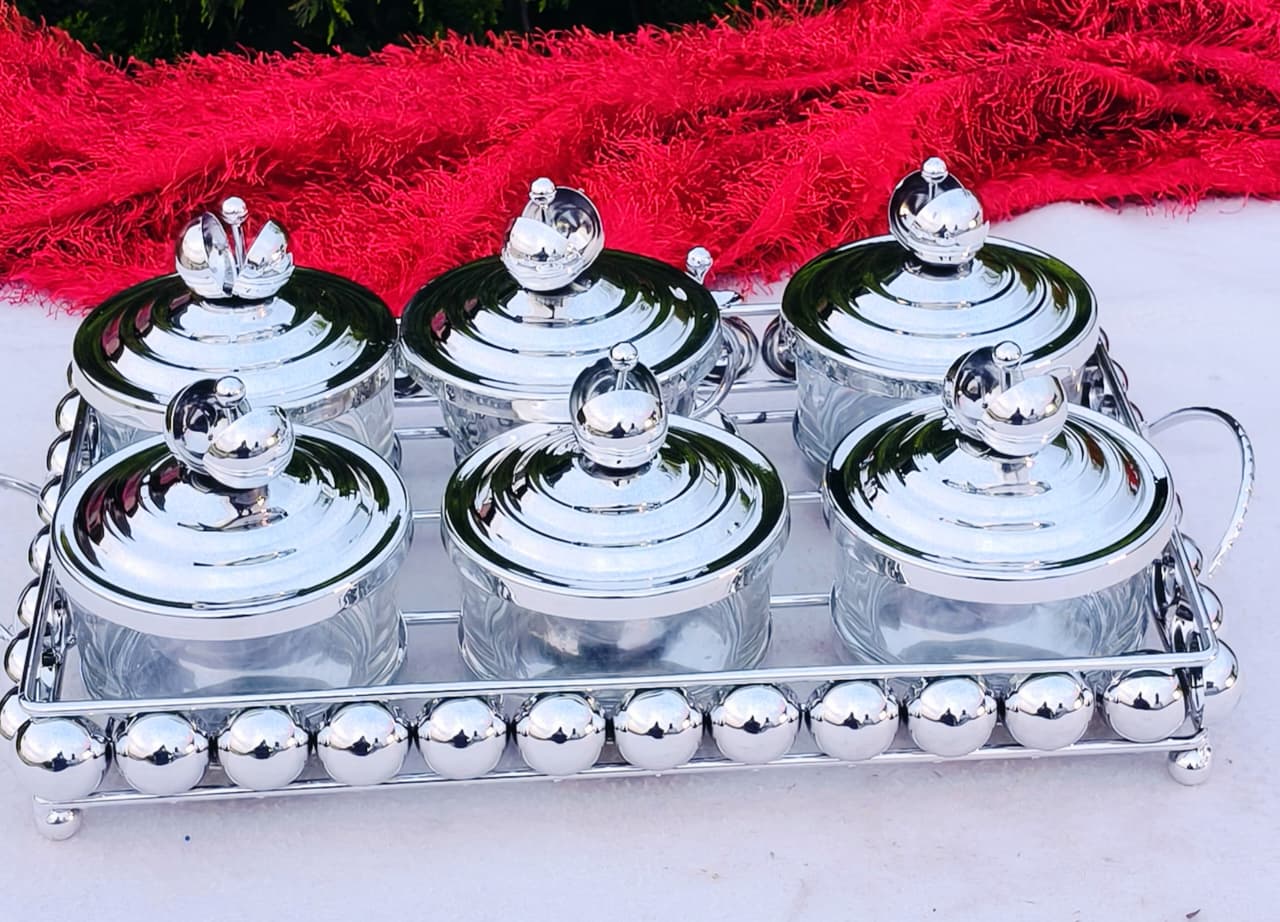 German Silver 6 Dry Fruit Jar With Tray Set GRP2GSPD.6400.GS72
