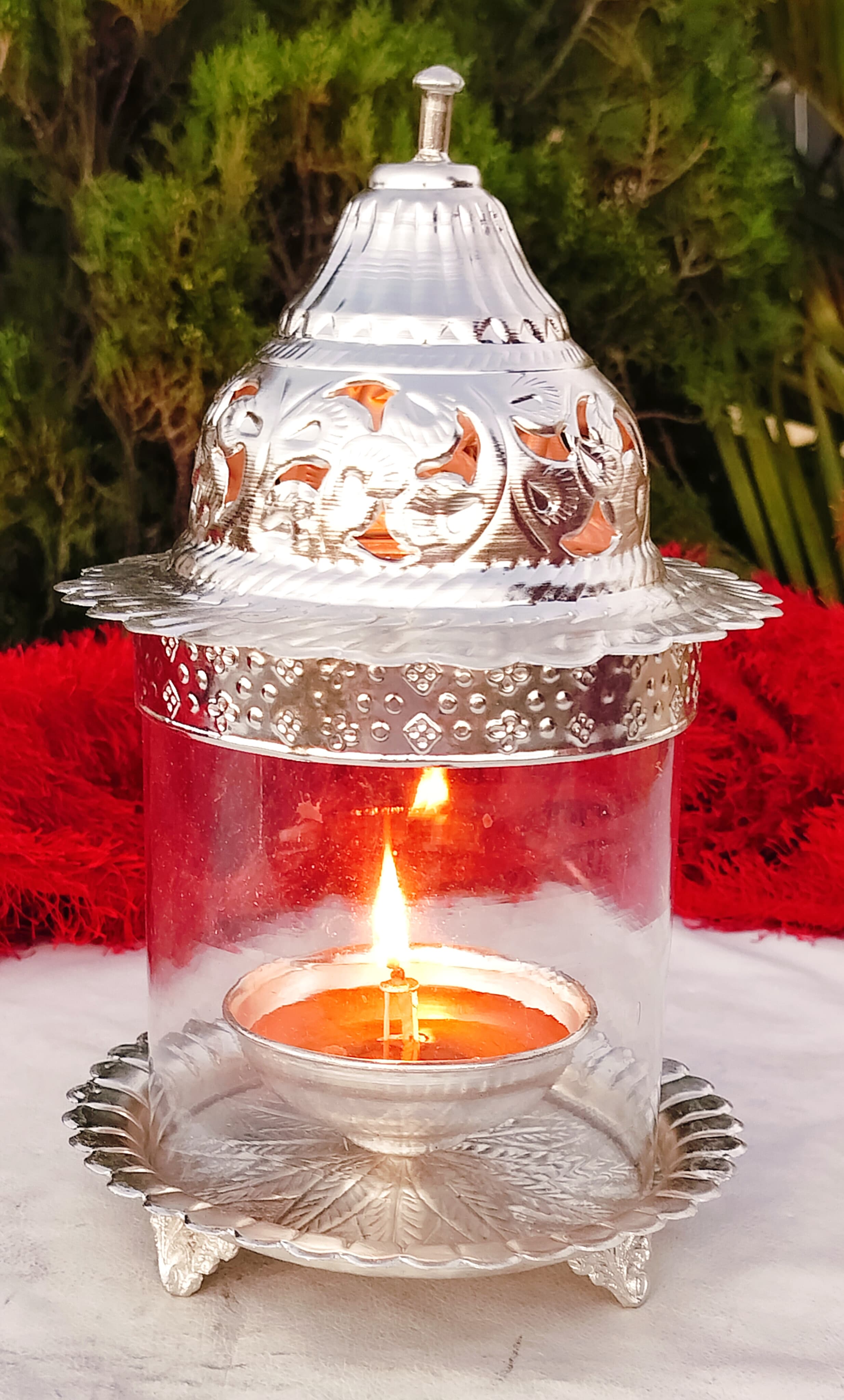 Illuminate your home and pooja space with this German Silver Big Size Akhand Diya, designed for long-lasting brightness and divine ambience. Its large size and deep oil capacity make it ideal for extended lighting during special occasions and rituals. Perfect for Navratri, Diwali, Keertan, Mangal Path, and daily pooja, this diya combines tradition with elegance. Product Details: Material: German Silver with antique finish Design: Big Size Akhand Diya Oil Capacity: 3.25" diya dimension for long hours of lighting Size: Base Width – 6" inch | Height – 9.5" inch Ideal for: Festivals, religious ceremonies, temples, pooja décor, and gifting A timeless symbol of spirituality, this Akhand Diya spreads positivity, peace, and prosperity wherever it is placed.