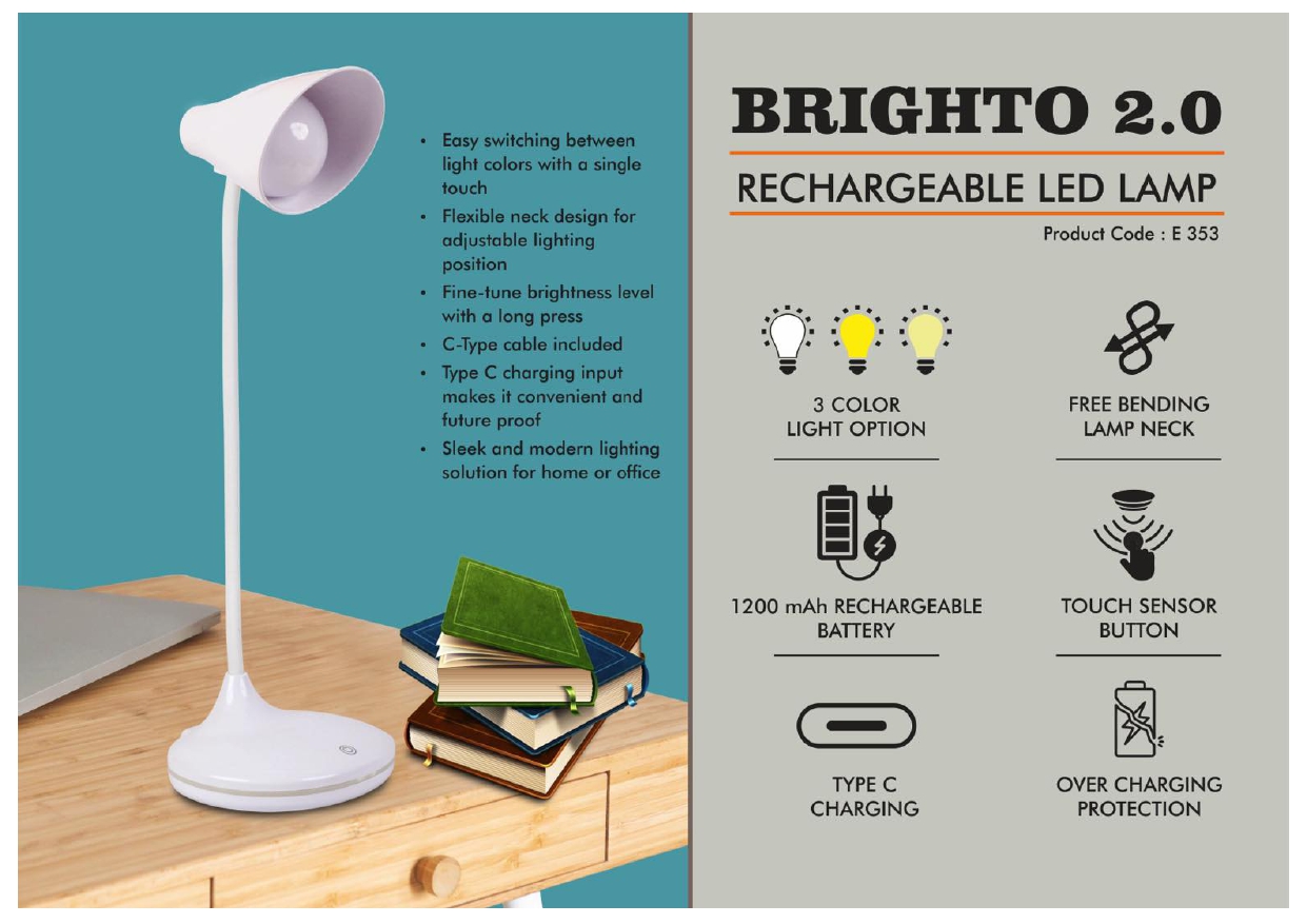 E353 – Brighto 2.0 : Rechargeable LED lamp | 3 Color light with Brightness adjustment | Type C Charging