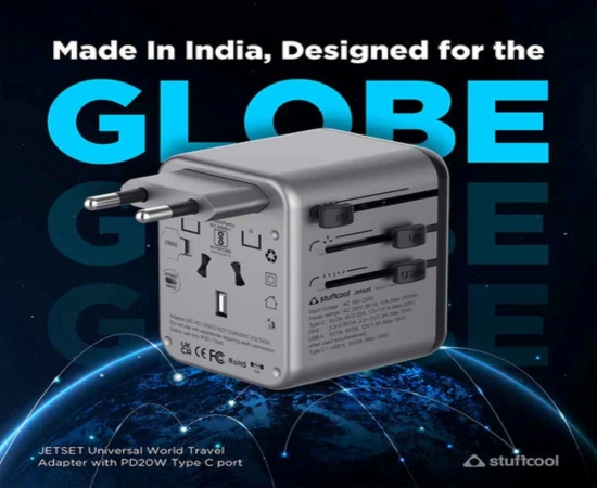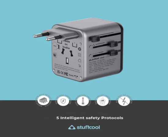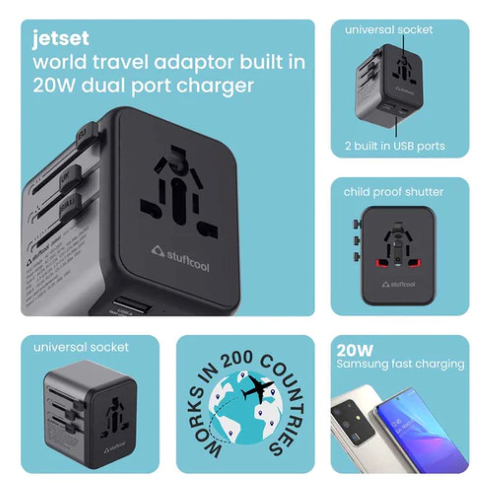 Meet the Stuffcool Jetset – a sleek, Made-in-India universal travel adapter designed for globetrotters who demand style, speed, and safety. Compatible in 150+ countries, Jetset keeps you charged wherever your journey takes you, with built-in plugs for the EU, UK, USA, and AUS. Power up to three devices simultaneously and enjoy blazing-fast charging with its 20W Type-C PD port. Engineered with intelligent protections like Smart IC with auto-detect, childproof shutters, and safeguards against voltage surges and short circuits, Jetset ensures your devices are in safe hands. Whether you're working abroad or exploring the world, this is the travel companion you can always rely on.