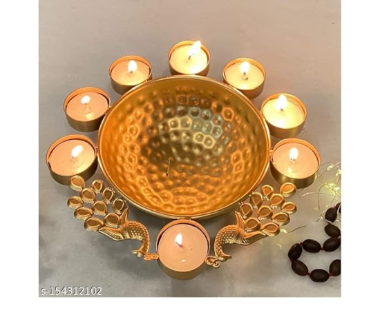 Golden Peacock Border Design Iron Urli Bowl/Candle Festive Home Decor Indoor and Outdoor, 10 inch
